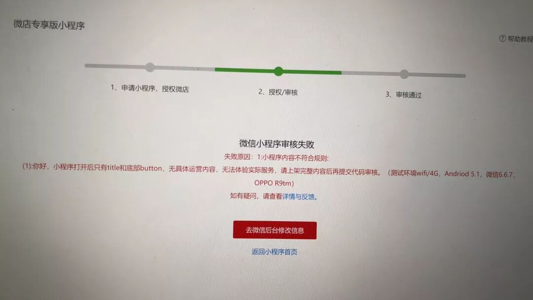 (1):你好,小程序打开后只有title和底部button,无具体运营内容,无法体验实际服务,请上架完整内容后再提交代码审核。(测试环境wifi/4G,Andriod 5.1,微信6.6.7,OPPO R9tm)