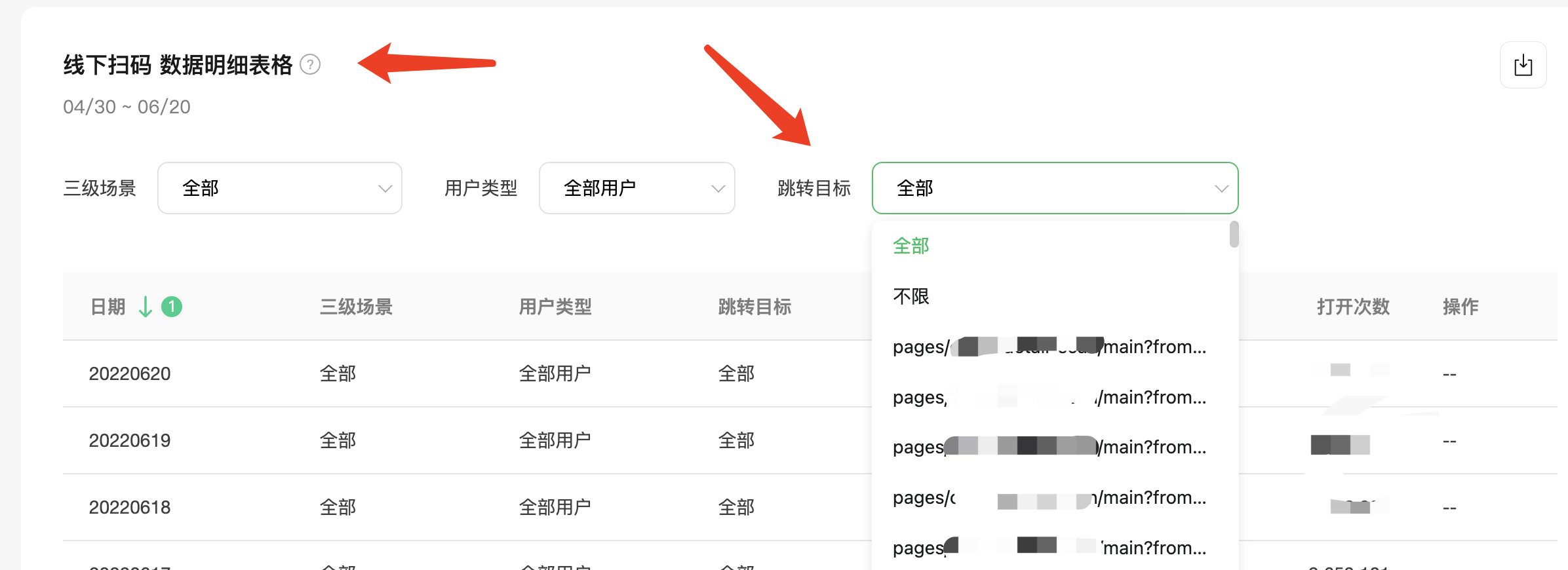 扫码渠道下的明细表格中,可筛选对应的跳转目标