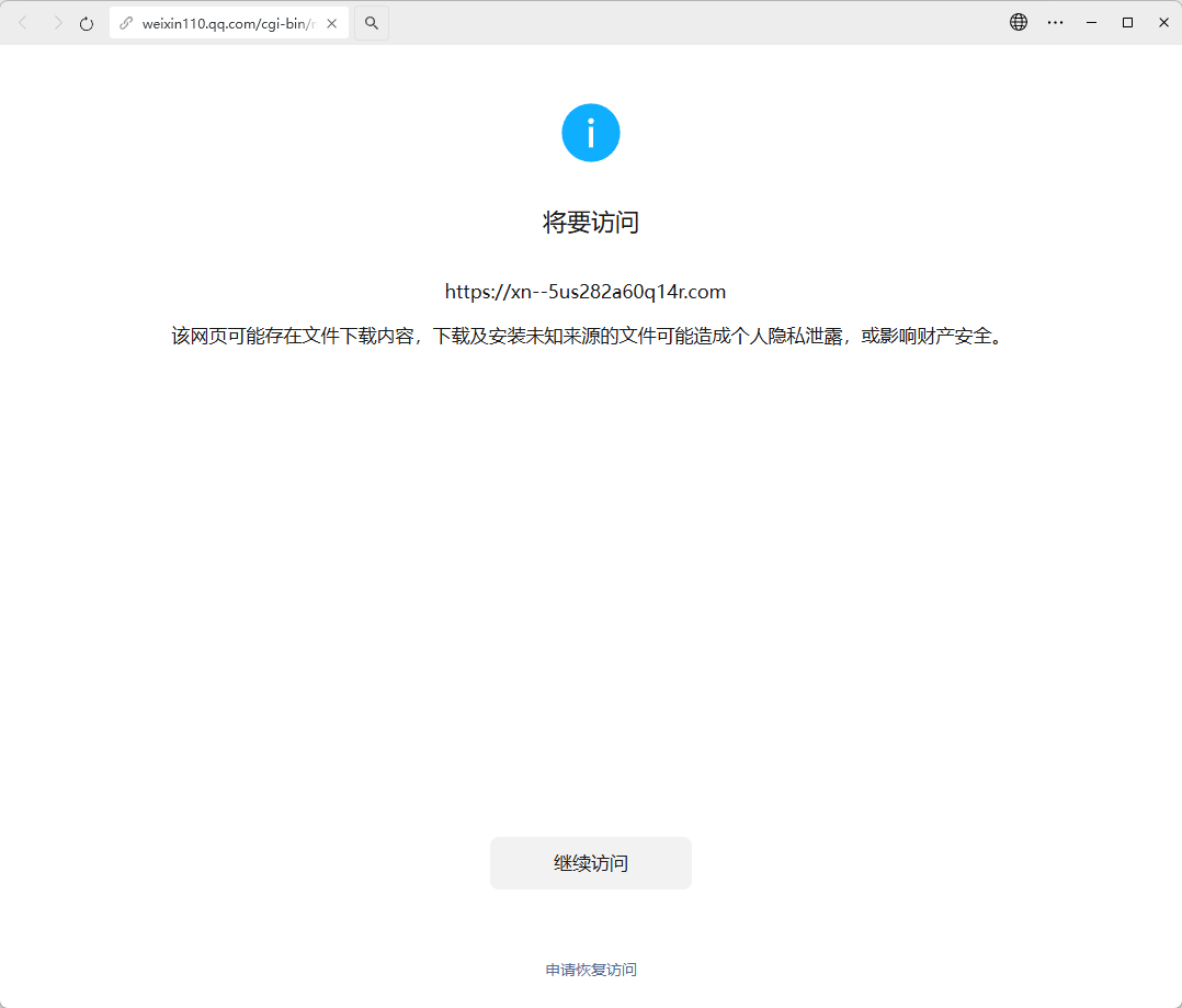 https://xn--5us282a60q14r.com/ 该页面在微信内显示时,已经不存在提示的这个apk下载链接,但还是会出现这个拦截页,申请恢复访问。