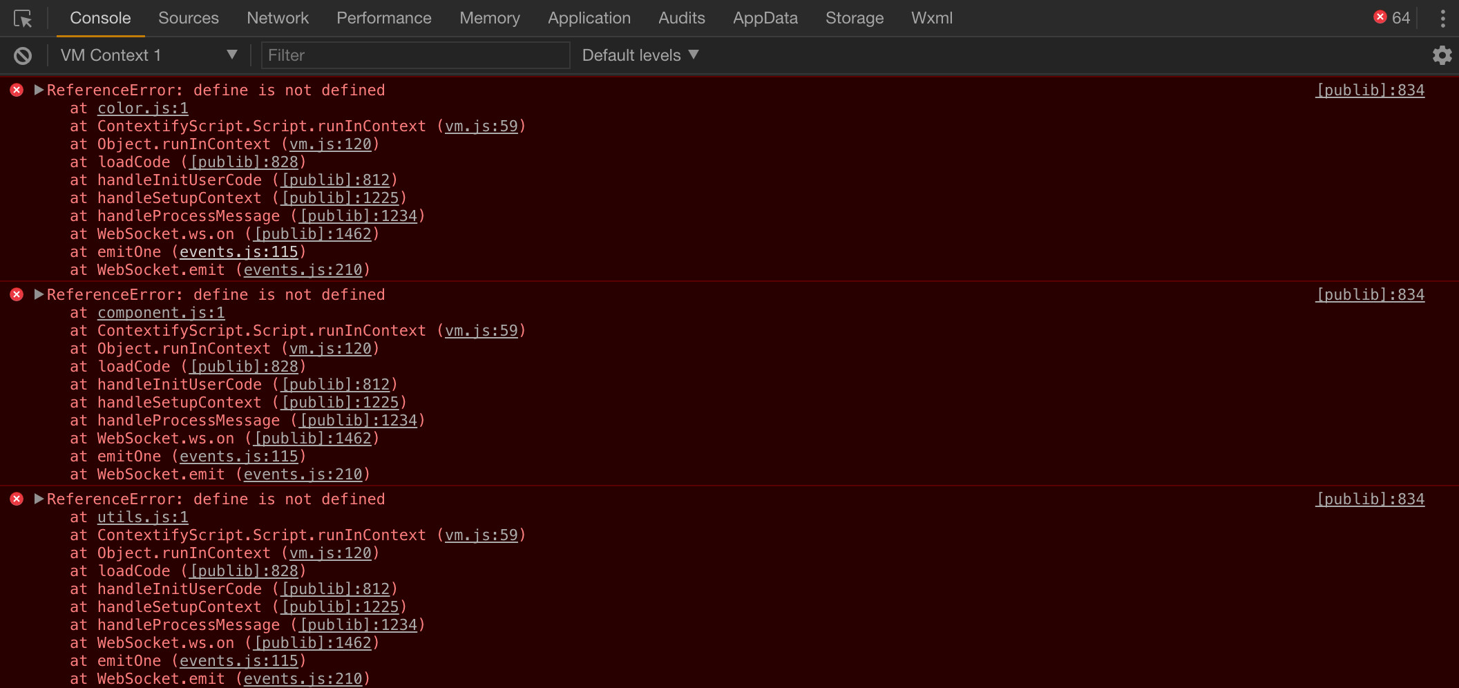 以上是真机调试的结果,很多很多没有定义的报错,定位的位置并不是我自己写的代码而是后期编译的时候生成的。预览和体验版都是一点报错没有的。