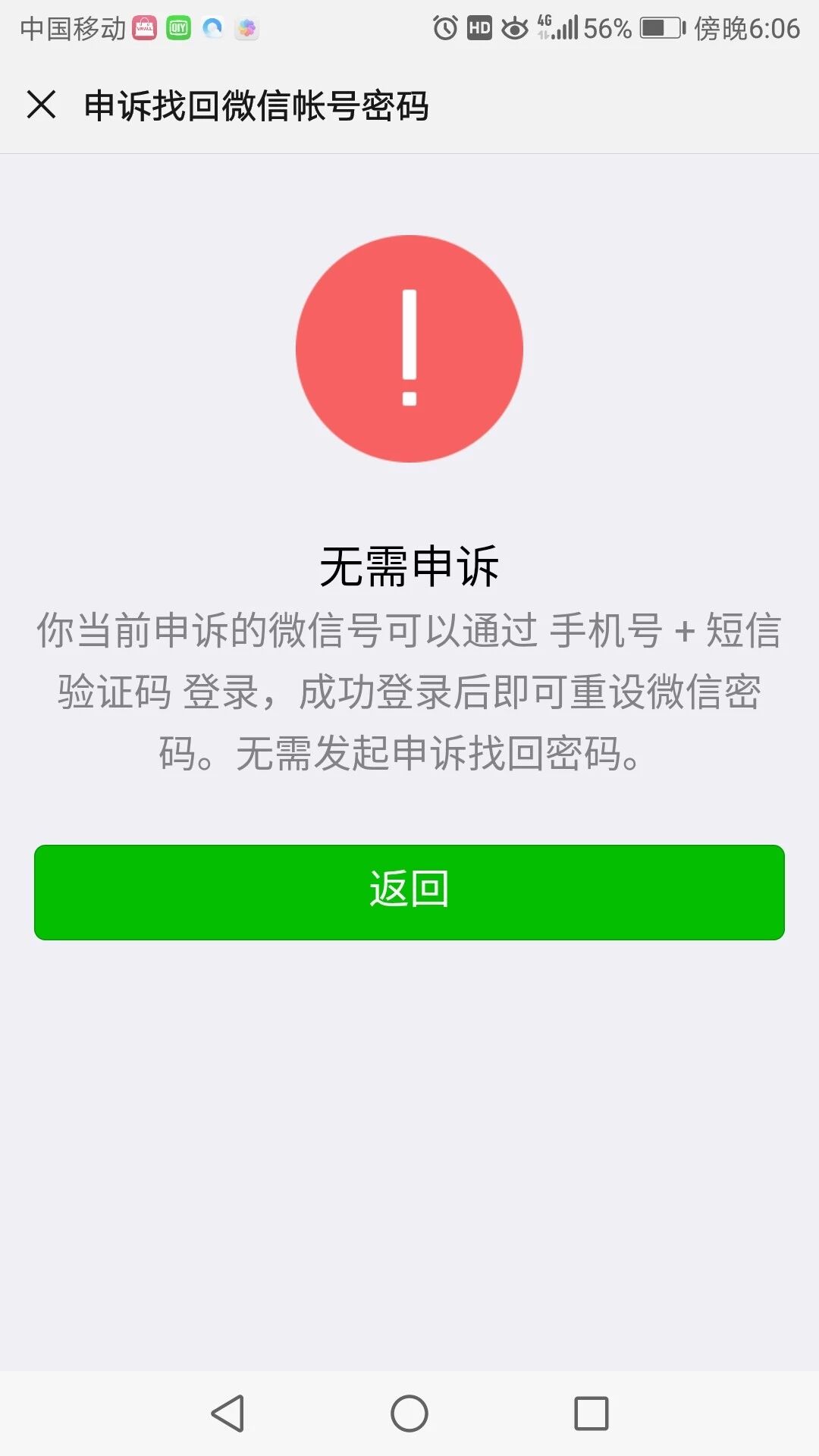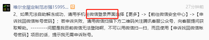 问题描述:无意中自己用手机冻结了自己的微信账号,接下来使用该手机进入官方推介的解冻程序,最后显示“当前解冻设备与冻结使用设备部一致”的页面。然后我开始使用腾讯客服人工电话,按类别要求选择,最后 客服一直要求我登陆微信和腾讯微信公众号联系,问题是我目前无法登陆使用微信啊。人工客服电话也一直是智能语音转接让我登陆微信。进入一个死循环。目前不知道如何解决。
