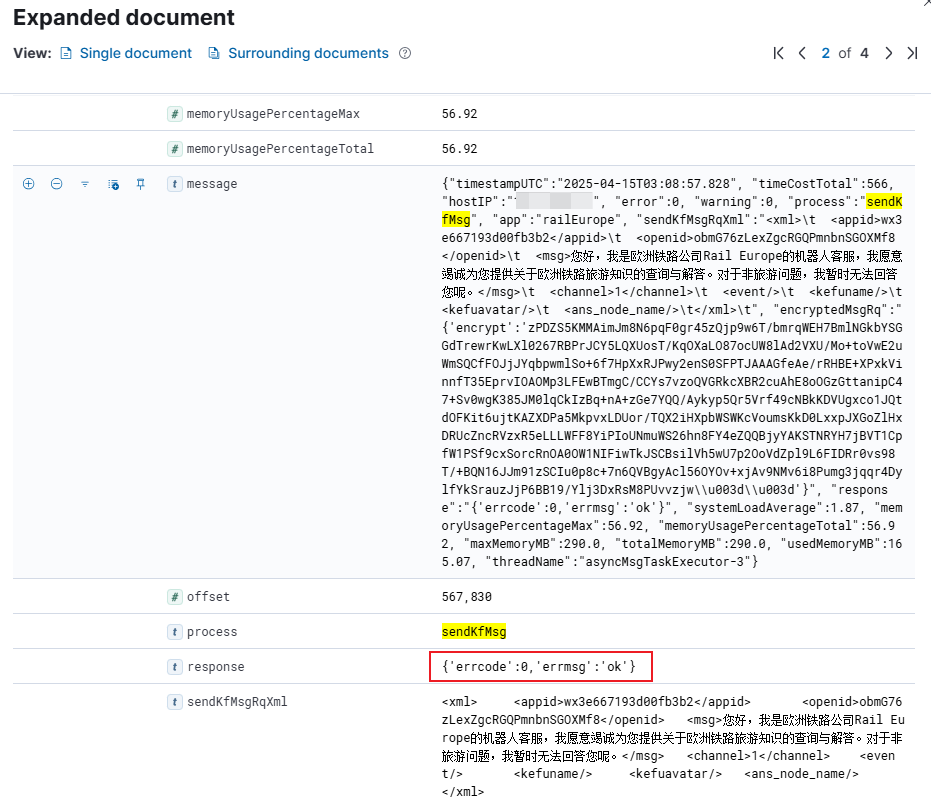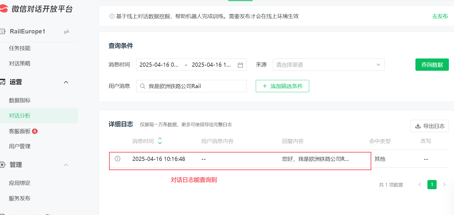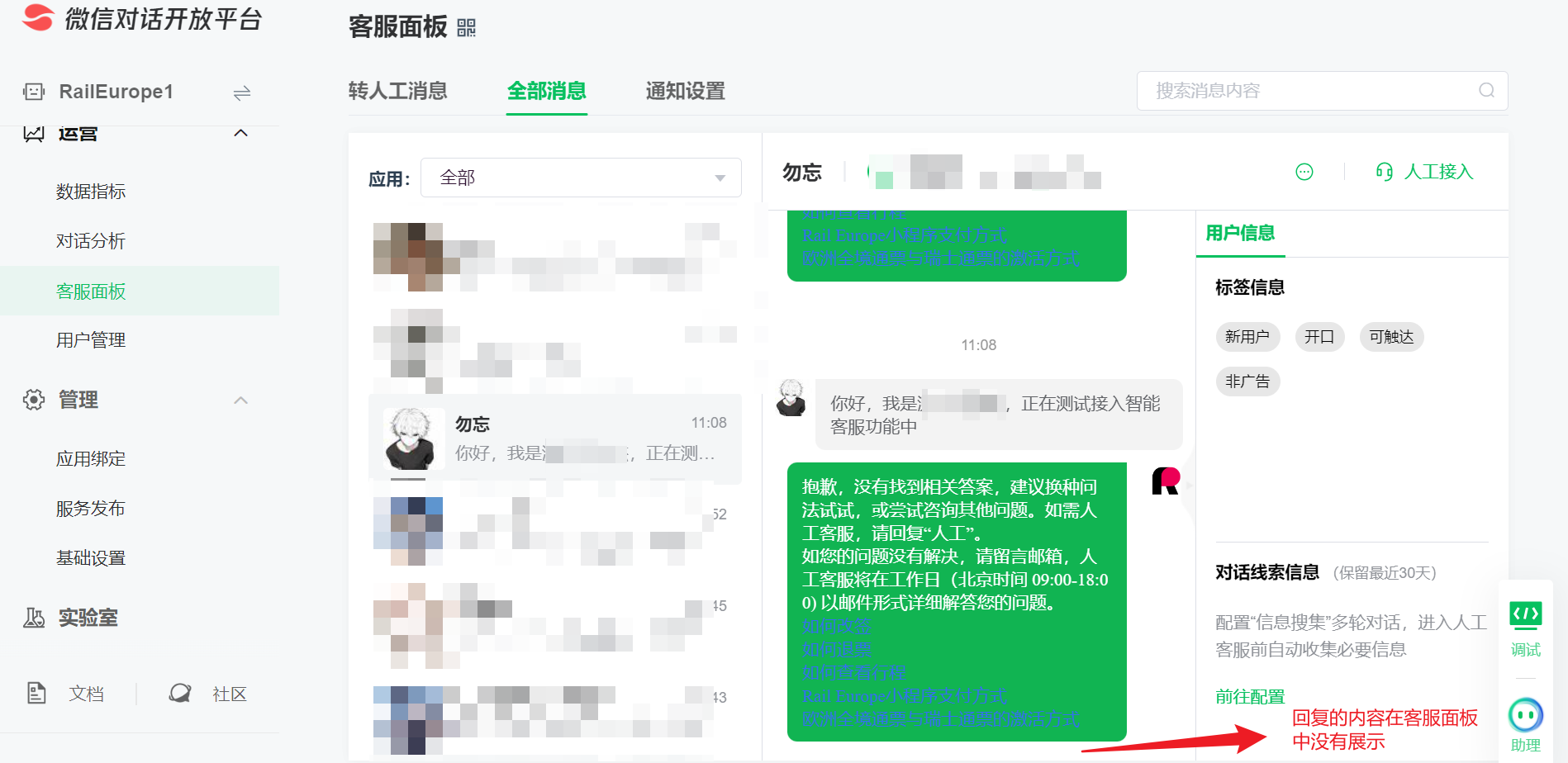 对话日志是能查到记录的,但客服面板的聊天对话中就没有展示