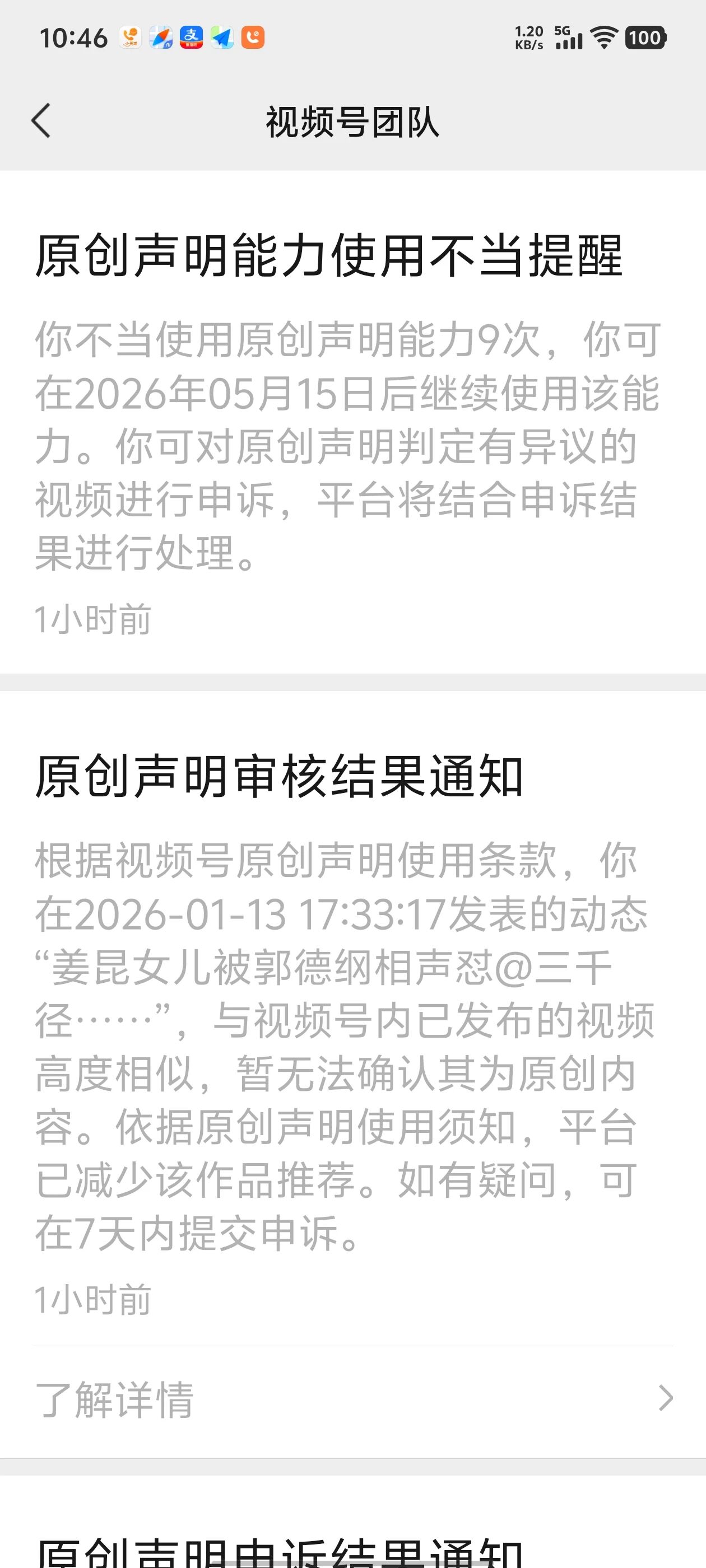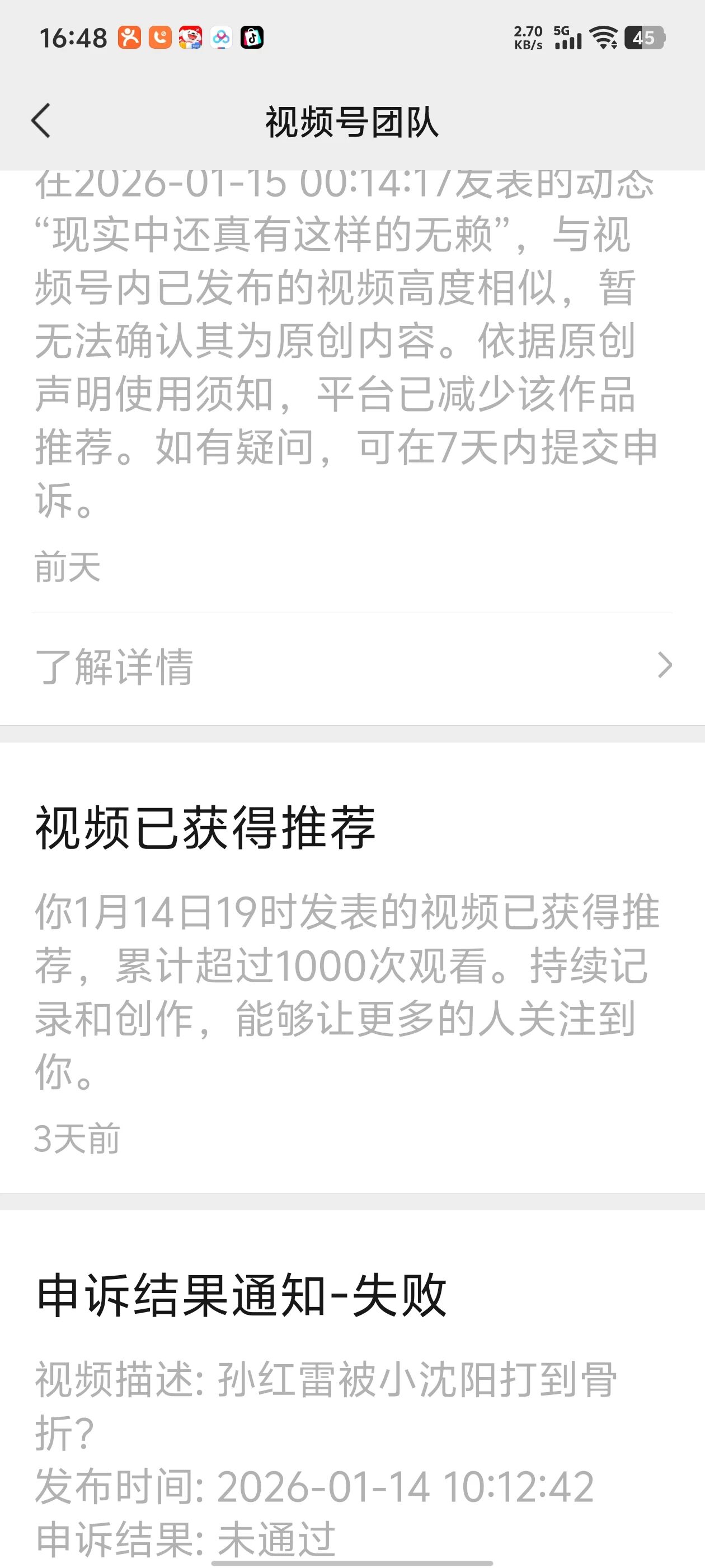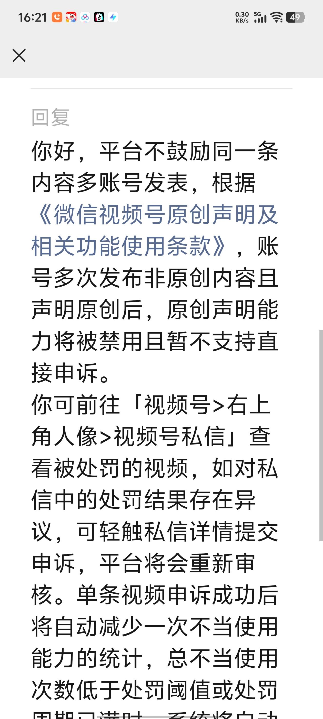 此前,我有一条视频播放量达到16万,却被平台要求提供内容真实性证据,随后该视频遭到限流。我第一时间提交申诉,结果申诉失败,同时平台判定我有6条视频属于翻拍,直接封禁了我一个月的原创功能,即便这些视频都是我真人出镜拍摄的,也未被认可原创性。