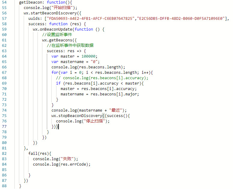 直接提供的代码片段无法复现,因为代码里面的uuid是我这边ibeacon设备的。而且必须获取到设备后才会输出,而直接提供的代码没有可获取的设备。