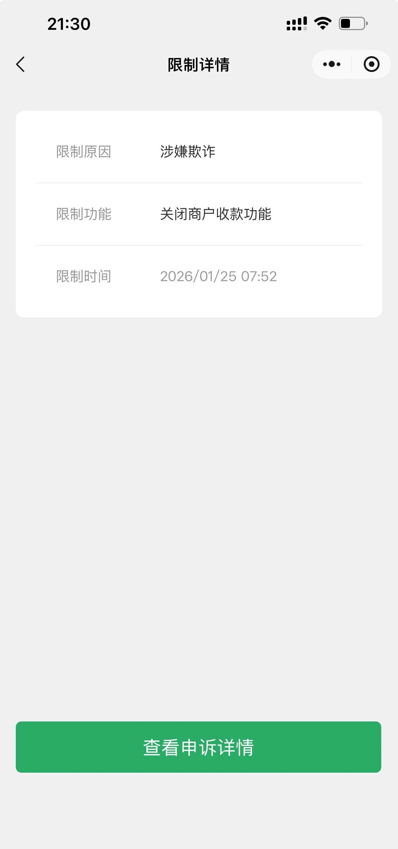 一个正规的企业收款码,用了好几年了,突然间被限制收款了,支付宝还可以用,就是微信不能用,提交申诉需要的资料都提交了,还是不给通过,好几个月了,没人给处理问题,这样的垃圾平台早晚被抖音支付宝替代,太垃圾了,典型的店大欺客,如果还不重视商户的问题,早晚倒闭,还有人给处理吧?
