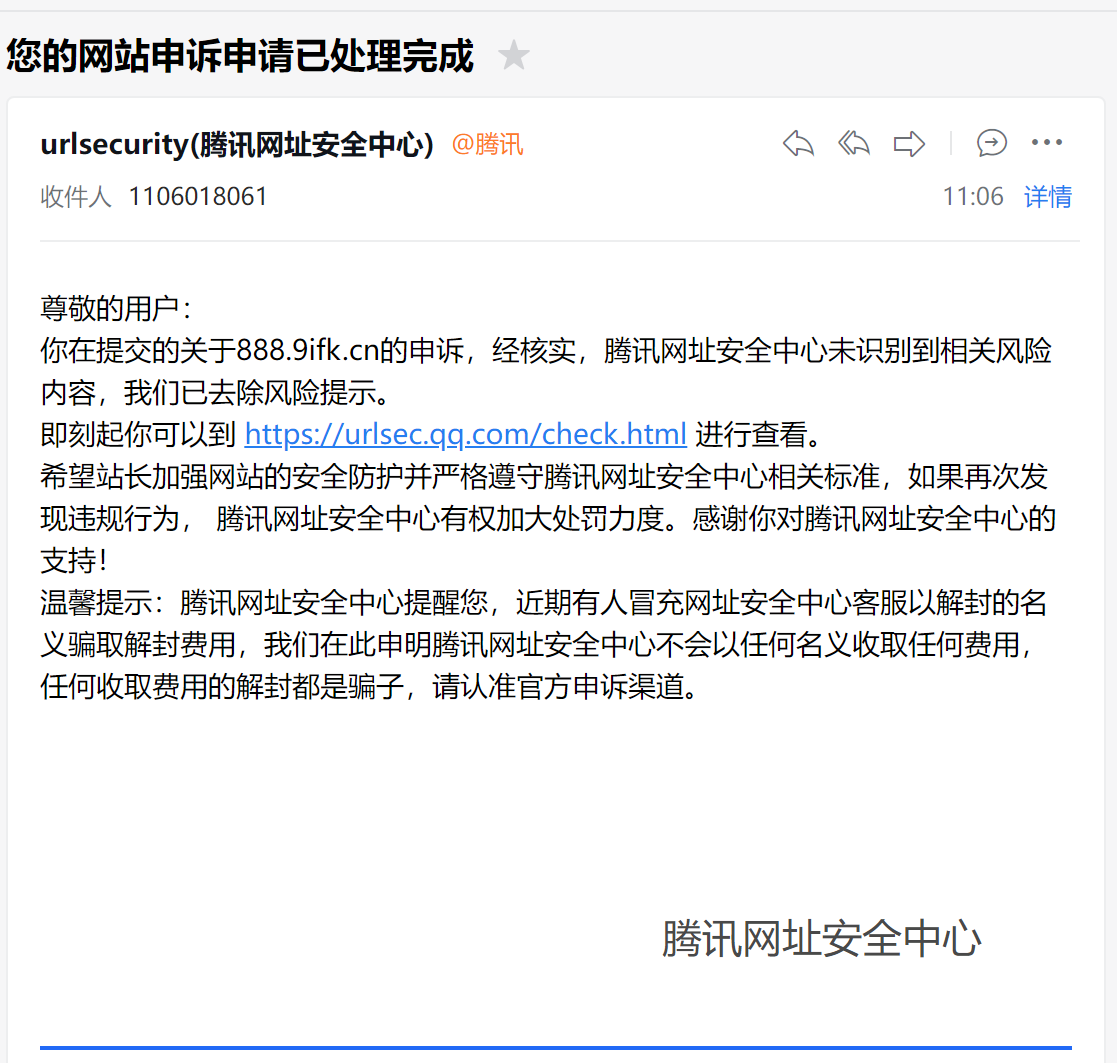 域名被微信拦截了域名为888.9ifk.cn,申诉后提示已经去除风险提示、现在依旧无法打开