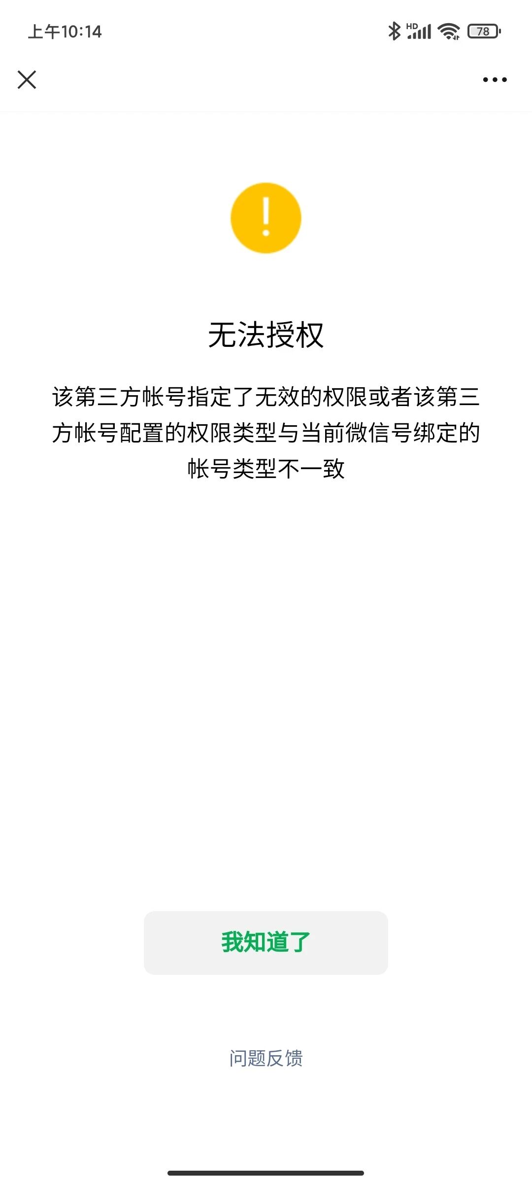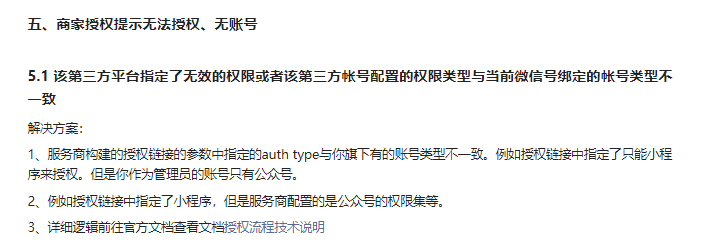 你好,请参考文档https://developers.weixin.qq.com/doc/oplatform/Third-party_Platforms/2.0/troubleshooting/authorization_troubleshooting.html#%E4%BA%94%E3%80%81%E5%95%86%E5%AE%B6%E6%8E%88%E6%9D%83%E6%8F%90%E7%A4%BA%E6%97%A0%E6%B3%95%E6%8E%88%E6%9D%83%E3%80%81%E6%97%A0%E8%B4%A6%E5%8F%B7