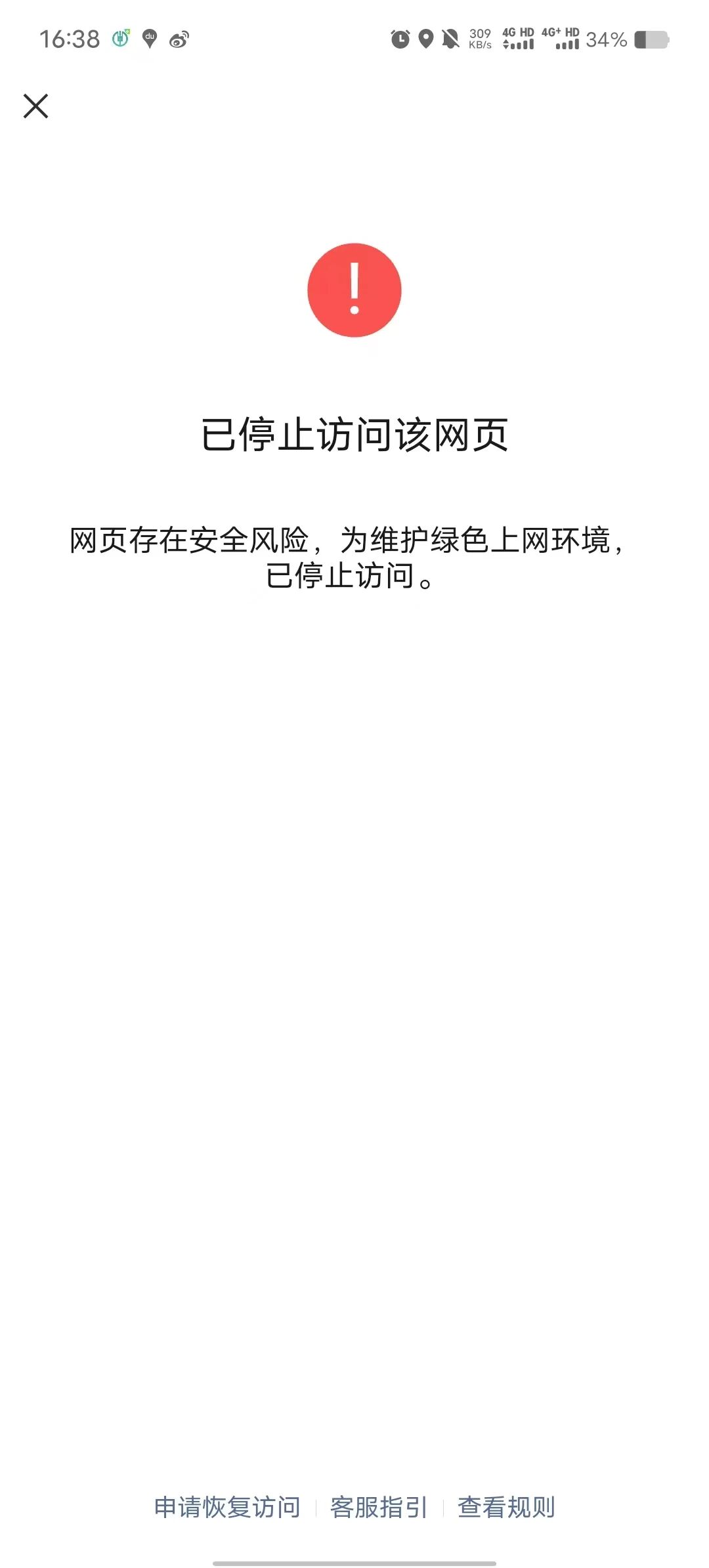 图一正常进入使用, 在搜索中搜索服务号出现的结果显示已停止访问(如图三),发送链接到微信点击同样显示已停止访问,部署站长验证还是会出现已停止访问