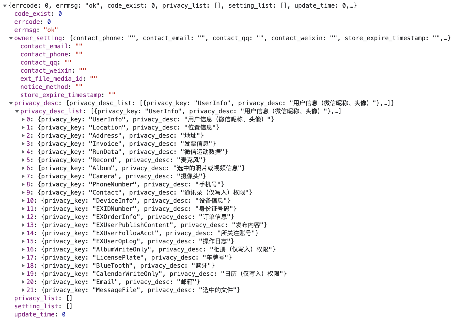 第三步:调用查询小程序用户隐私保护指引接口这样的操作顺序查询的隐私列表就不会是空的了