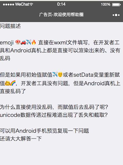 <view class="intro"><view>问题描述</view><text>emoji 🍄🚗✈️🔥 直接在wxml文件填写,在开发者工具和Android真机上都是直接可以渲染出来的、没有乱码但是如果用初始值赋值{{emoji}}或者setData变量重新赋值{{emoji2}},开发者工具没有问题,但是Android真机上直接乱码了为什么直接使用没乱码,而赋值后去乱码了呢?unicode数据传递过程难道出现了丢失和截取?可以用Android手机预览复现一下问题还请大大解答一下</text></view> |