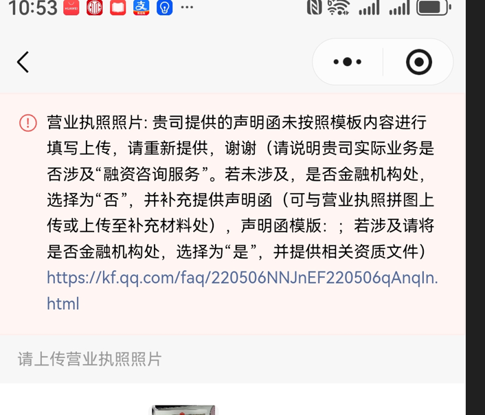 营业执照照片:请补充说明贵司实际业务是否涉及"融资咨询服务",若未涉及,请补充提供声明函,声明函模版:;若涉及请将是否金融机构,选择为"是",并提供相关资质文件。
