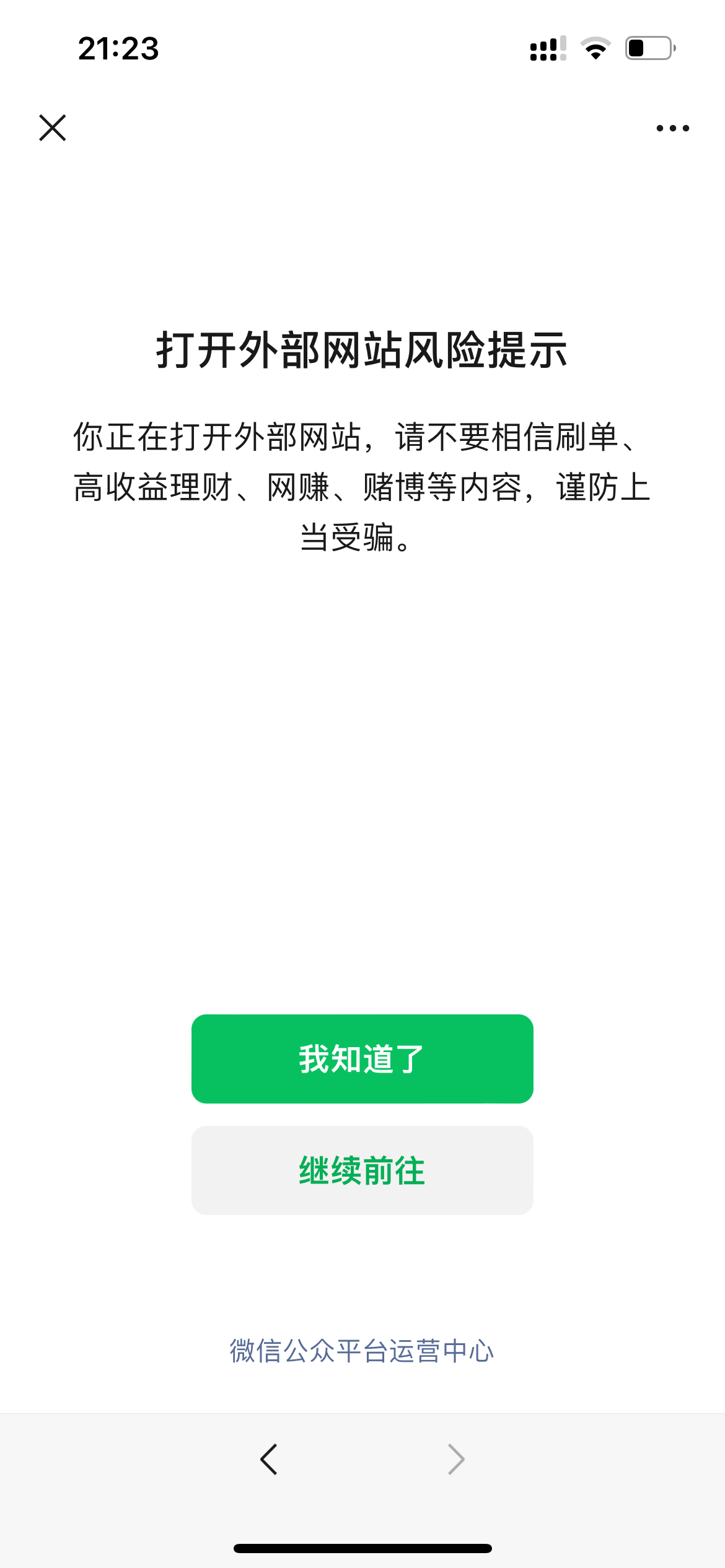 目前无解决办法,只要打开外链都有可能触发这个提示,建议可以去除外链。可参考公告https://developers.weixin.qq.com/community/develop/doc/000e86a66d073016dd3c7e12956809