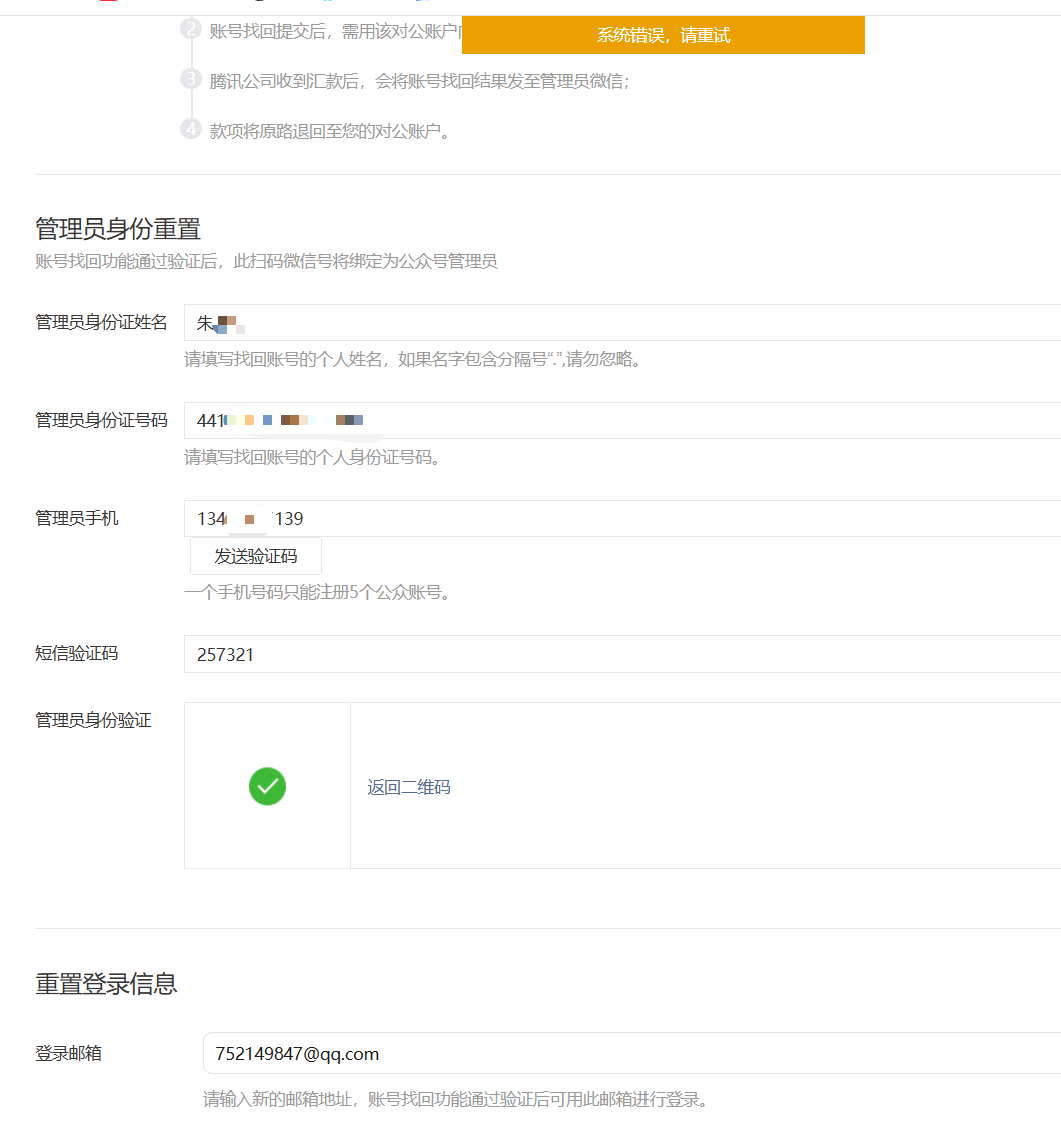 之前管理员离职,现在需要找回重新设置,找回账号和主体修正均显示系统错误,请重试,时间2025年4月14日12:01。新邮箱设置为1641158416@qq.com 麻烦帮忙处理一下,谢谢!