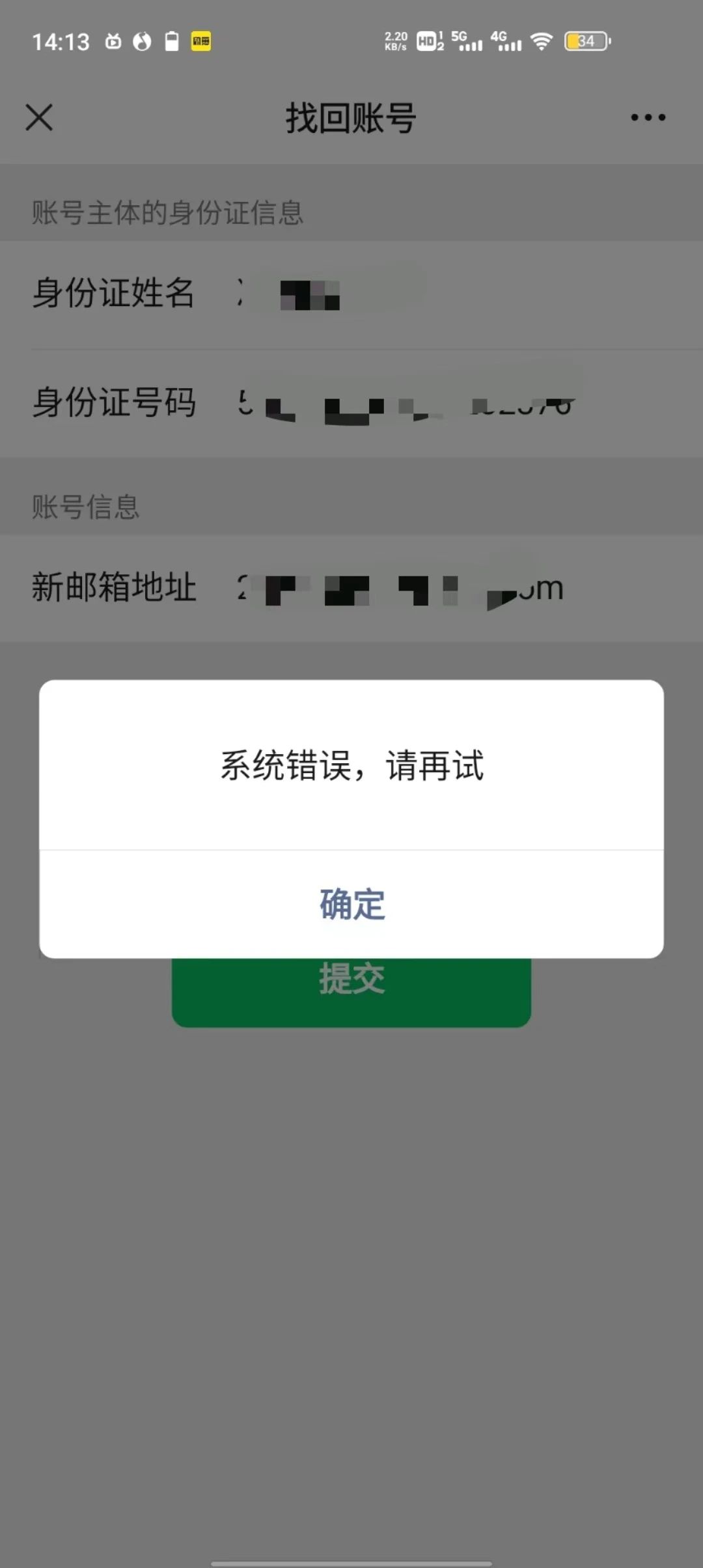 账号:gh_fcf3be09115e 开发人员 账号长期未使用被冻结 找回时一直弹窗为“系统错误,请重试”