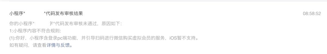 小程序网页版不存在支付功能,且已通过iOS去除支付功能的人工审查,但近日的连续数次提交均提示“:你好,小程序含登录pc端功能,并引导扫码进行微信购买虚拟会员的服务,iOS暂不支持。”