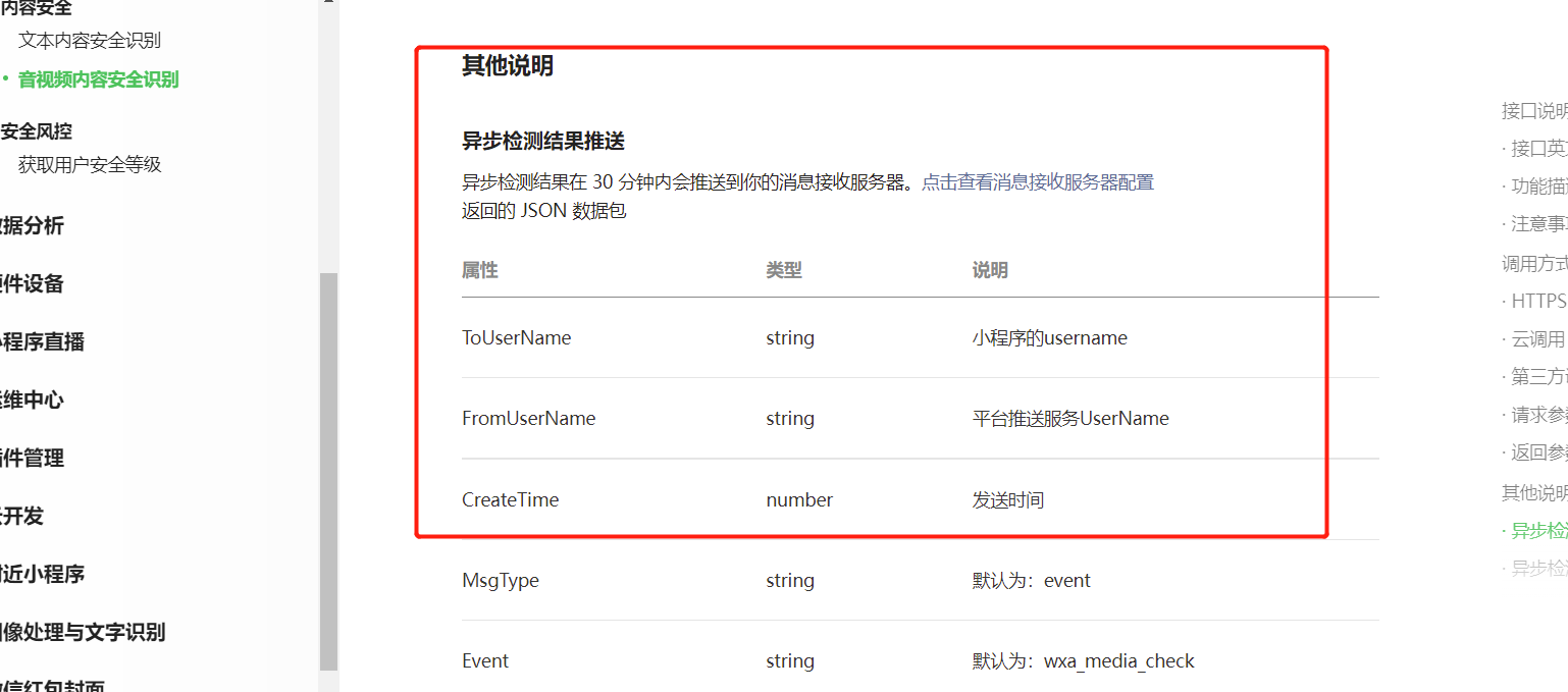 音视频内容安全识别中获取不到异步检测结果的推送,微信公众平台小程序消息推送也配置了,只收到以下结果