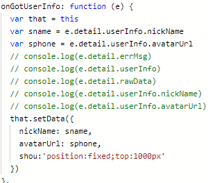 //只有这样才能拿到你这个e 这种情况 不能在onLoad里调用 <button open-type="getUserInfo" bindgetuserinfo="onGotUserInfo"/> onGotUserInfo(e) { if (e.detail.errMsg === 'getUserInfo:ok') { let sname = e.detail.userinfo.nickName }