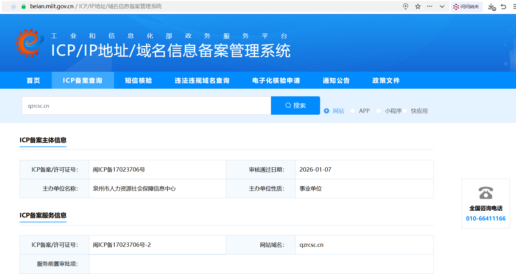 点击申请恢复访问后,一天后又不能访问。该域名为泉州市人社局信息中心申请域名,域名已经备案,备案截图如下