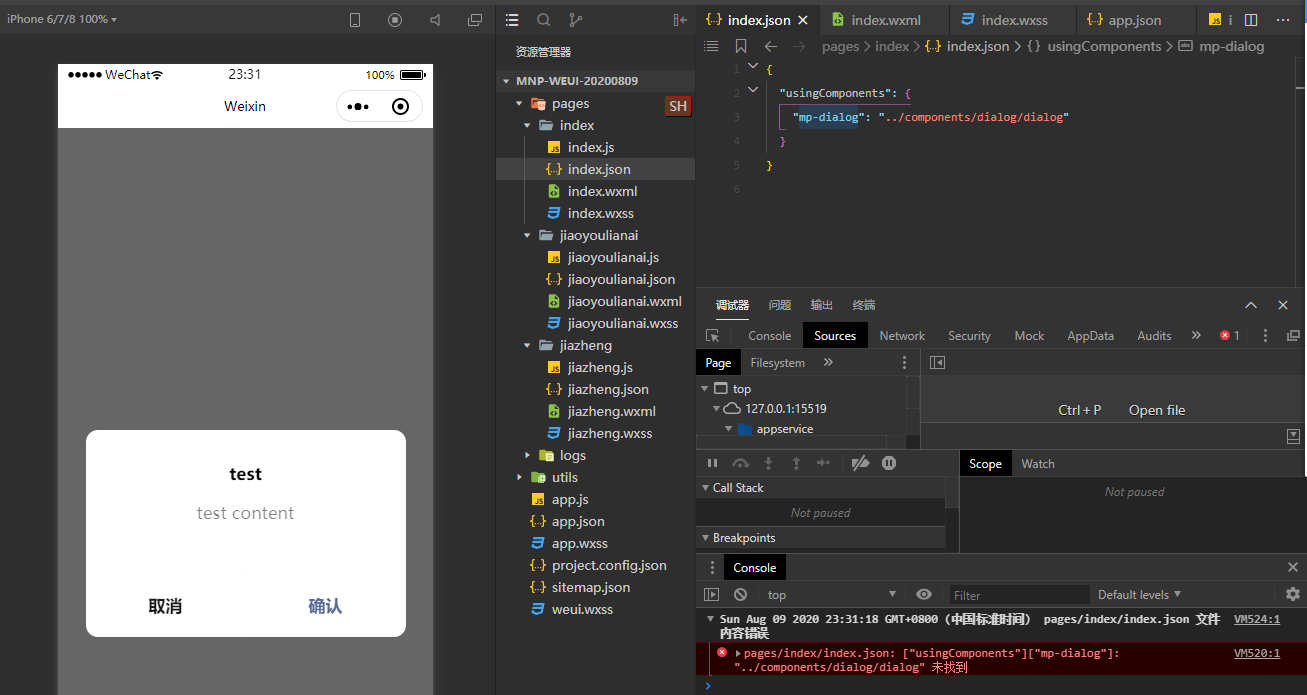 然而仿照WeUI快速上手页面中引入 dialog 弹窗组件的时候