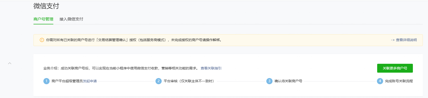 1、已接入订单发货管理的小程序,仅支持绑定【直连商户号】或是【服务商名下的特约商户号】;无【授权】按钮的商户号需解绑。