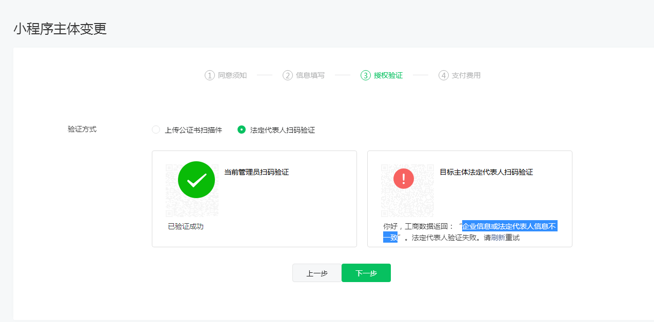 主体变更到授权认证的时候 出现企业信息或法定代表人信息不一致 ,就是注册的时候是个人现在要改成企业所有信息都是我自己,原主体跟目标主体都是我,就是把个人改成企业,这么麻烦吗 有没有大神解读一下怎么办,急急急