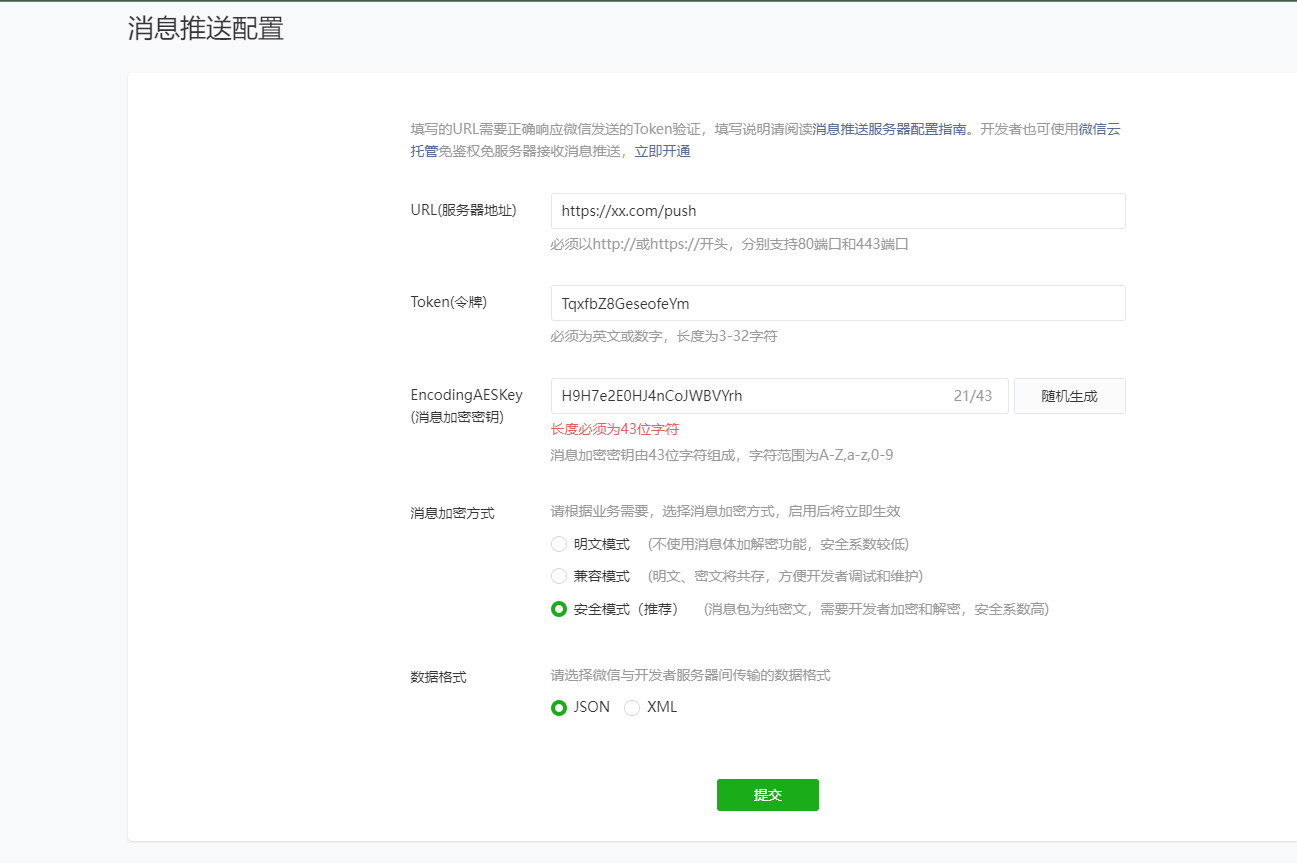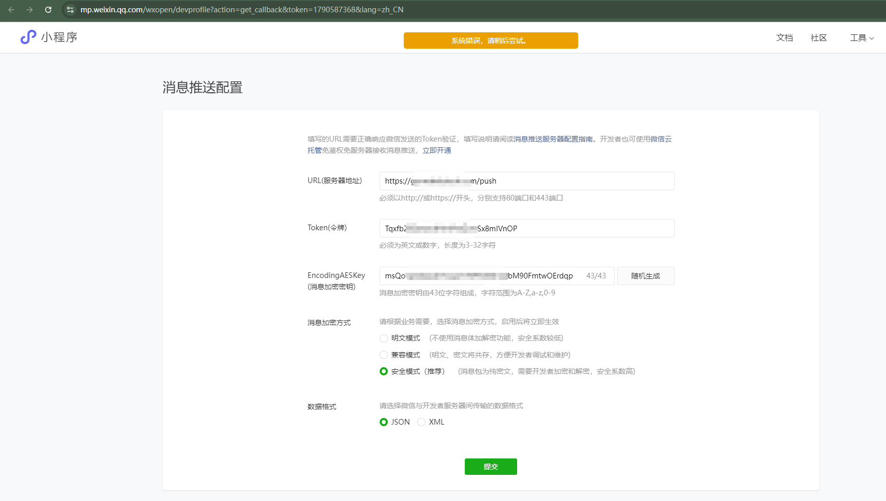 微信小程序-开发管理-消息推送配置-提交,一直报错。数据提交时是正确的,截图前我做了处理。此bug必现,已经持续两天。我的另外一个小程序号就能正常提交操作。请看下,谢谢!
