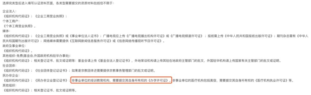 微信认证要求“非事业单位的培训教育机构,需要提交其自身所有权的《办学许可证》”