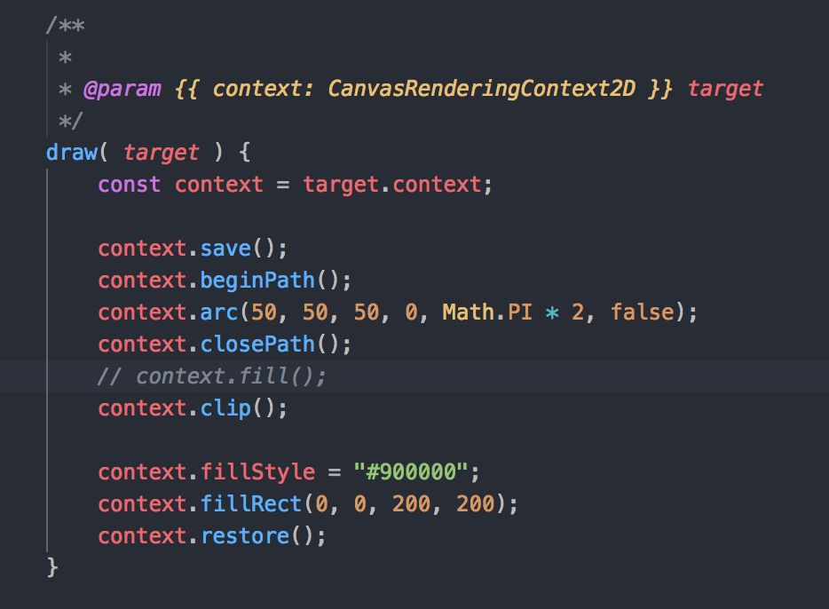 context.save();context.beginPath();context.arc(50, 50, 50, 0, 2 * Math.PI);context.closePath();// context.fill();context.clip();context.fillStyle = "#900000";context.fillRect(0, 0, 200, 200);context.restore();context.draw(false); |