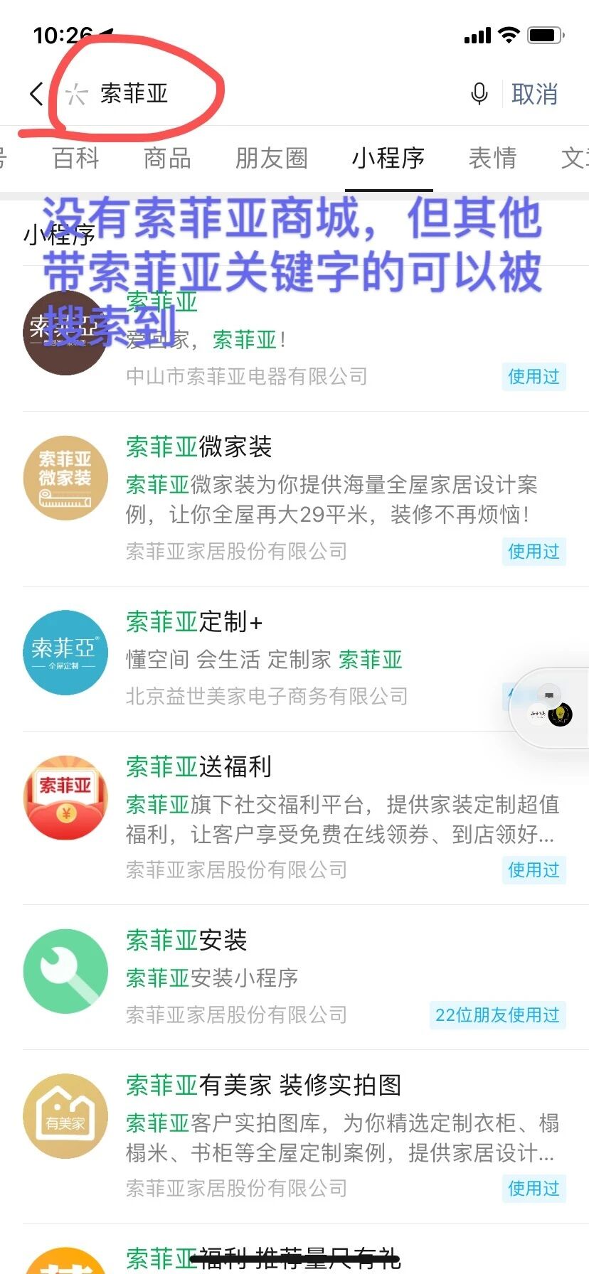 索菲亚官方小程序“索菲亚商城”,APPID:wx2179783e39a1f8f5 无法搜索品牌关键字索菲亚被搜索到,一定要搜索全程才能搜索到,求官方解决。