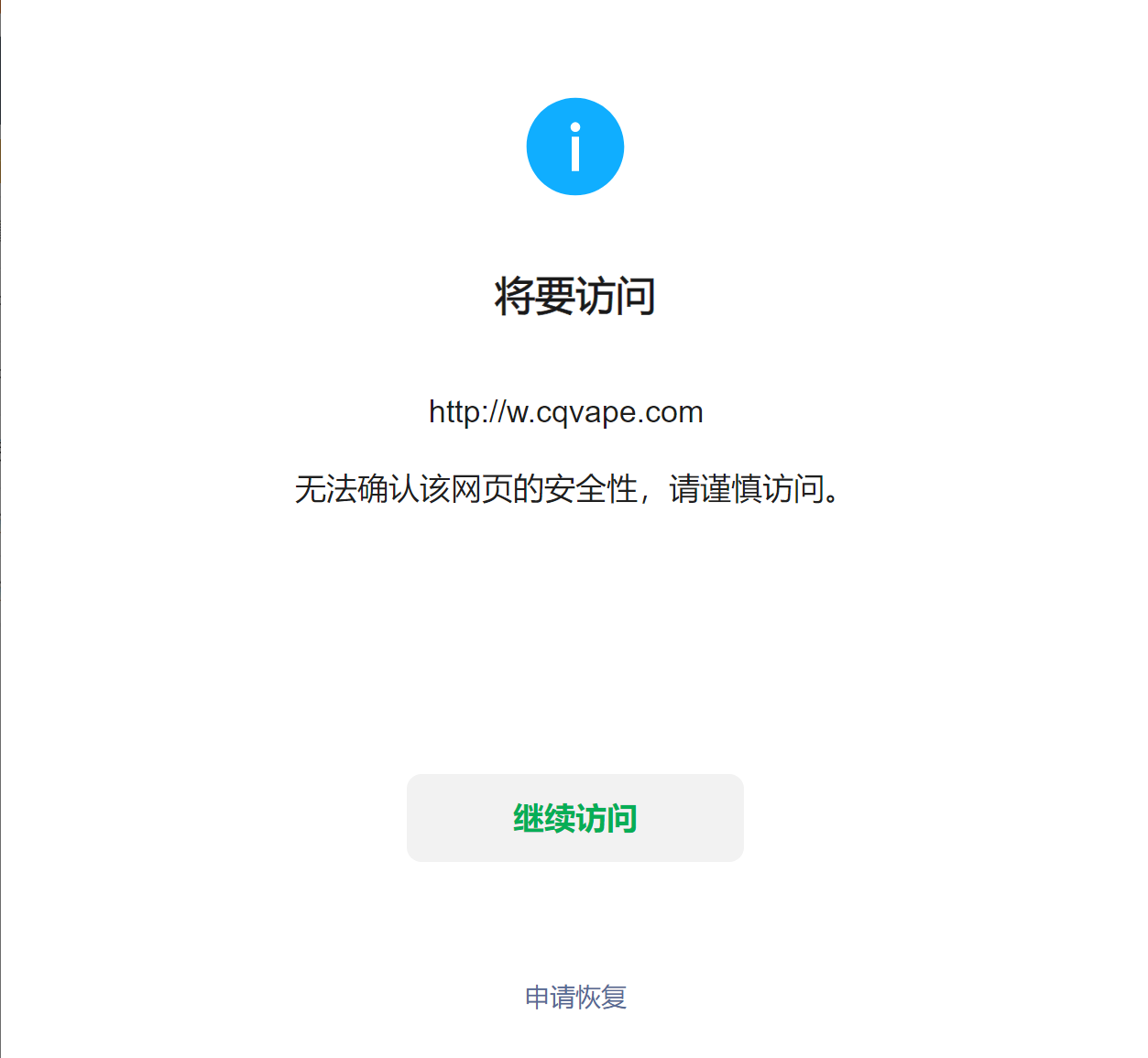您好,我是网站开发者,cqvape.com这个域名是我刚购买的域名,之前在微信里也是正常不会有这个提示,之前是一直正常,也还没有对外发布,昨天访问突然就提示“无法确认该网页的安全性,请谨慎访问”,之前都是正常的。本域名确保安全正规合法,望解除这个安全提示。