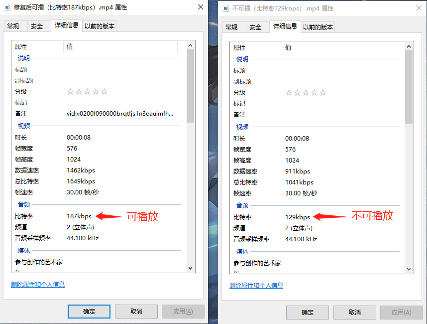 排查过程:将不可播放的mp4视频下载到本地,查看该视频的比特率为129kbps;然后使用视频修复软件修改该视频的比特率为189kbps;再次使用video组件播放这两个视频,比特率为189kbps的可正常播放了;