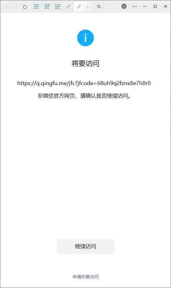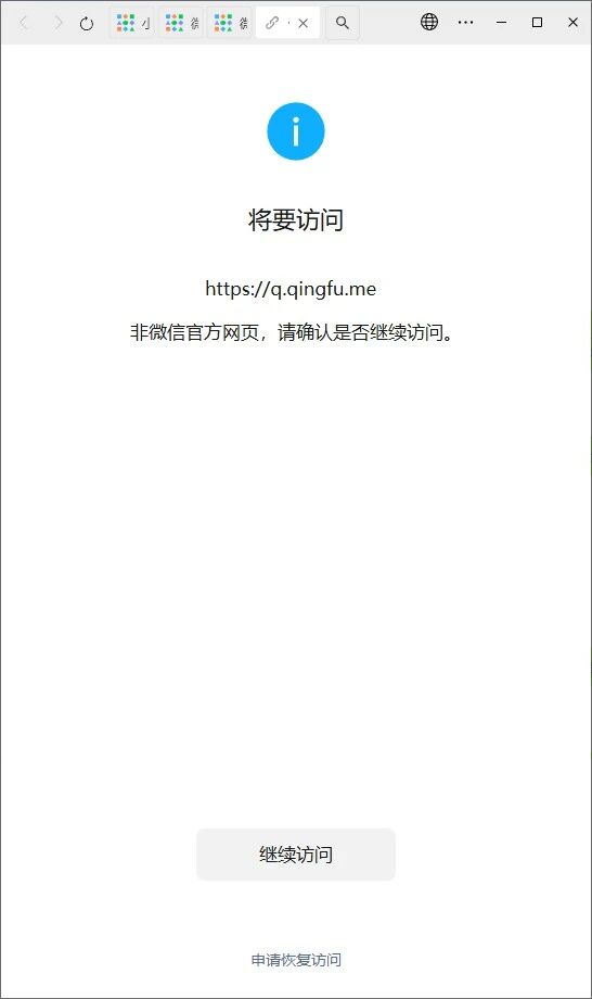 您好,域名qingfu.me购买并进行管局备案,https://q.qingfu.me浏览器访问正常,我是网站开发者,访问时间如图2026/1/15,点开网址提示“非微信官方网页,请确认是否继续访问”经检查网页里没有不安全的内容,请核实后帮忙解除拦截,谢谢!尽快处理,急急急,现在需要打开使用,谢谢