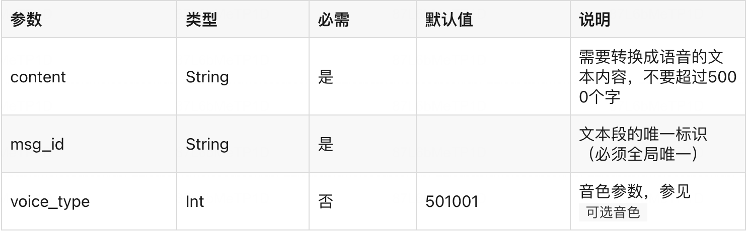 voice_type所属的音色类型。具体参考腾讯云文档:基础语音合成音色列表 - 本插件需要支付100元/年的授权费用,未授权的小程序每天只能调用5次。