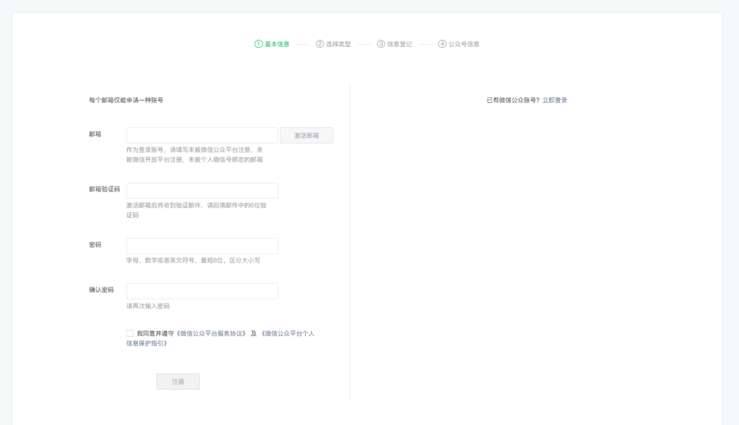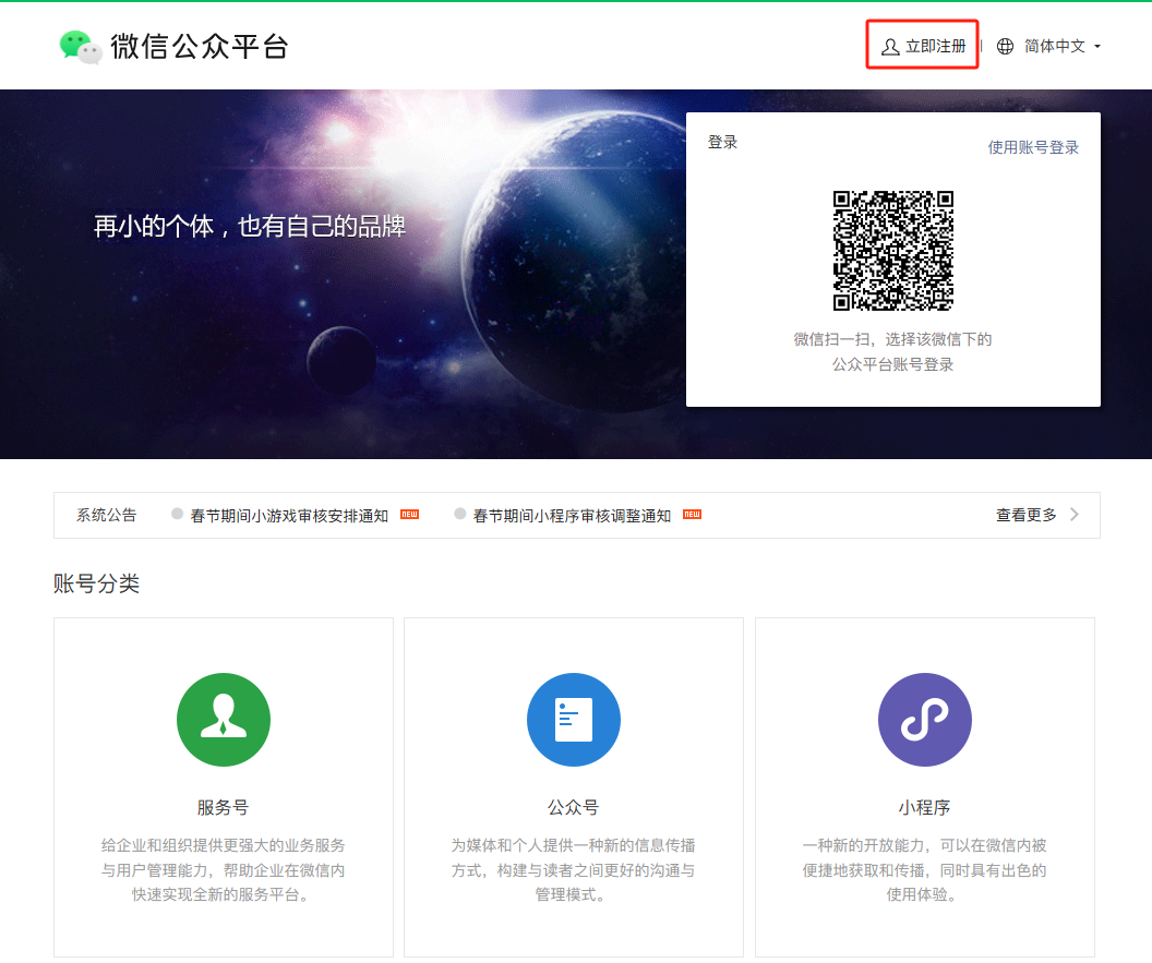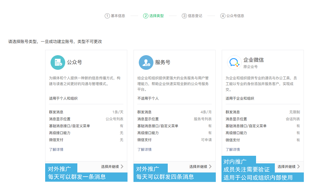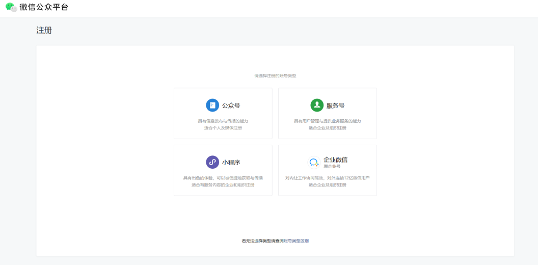 了解公众号、服务号和企业微信的区别后,选择想要的账号类型