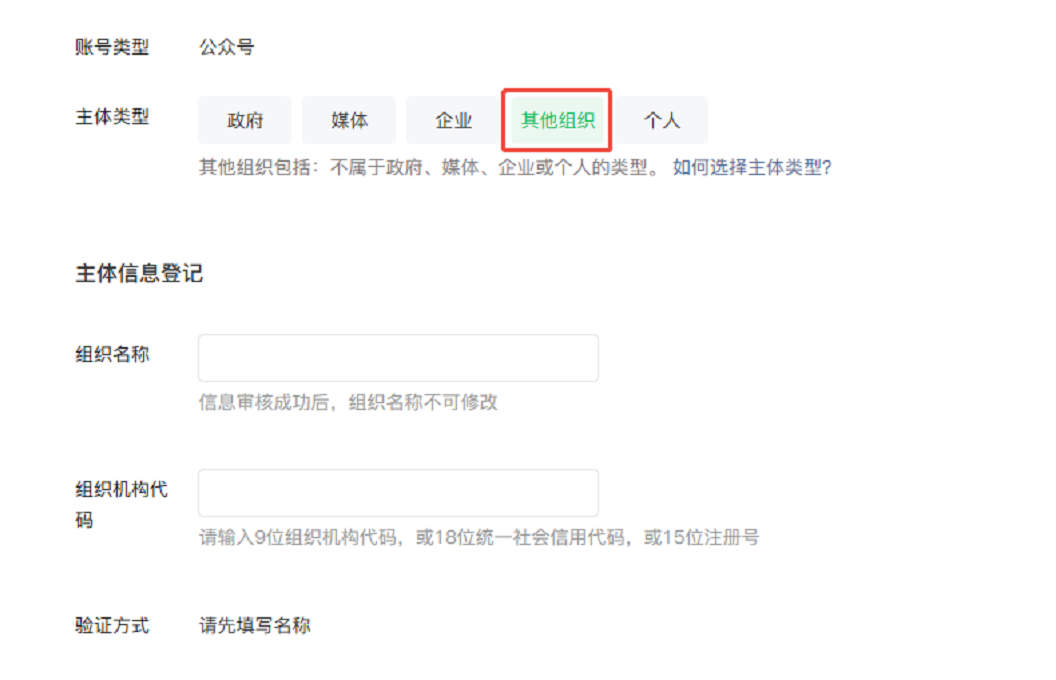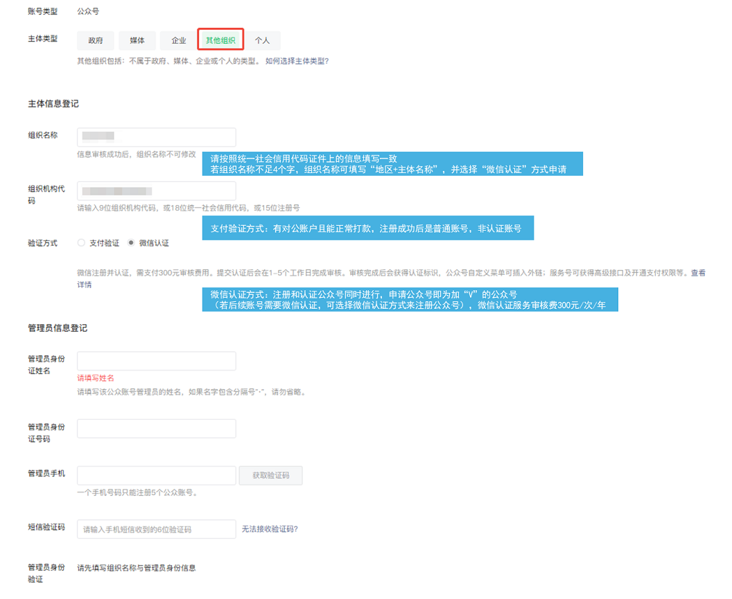填写组织名称、组织机构代码,选择注册验证方式(点击了解不同验证方式区别)、管理员信息
