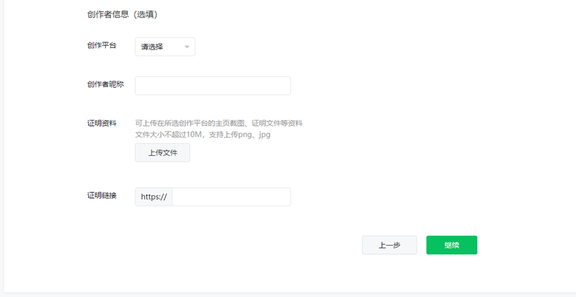 填写创作者信息,点击继续(如使用过其他内容创作平台,可填写相关信息。如没有,可无需填写。无论是否填写,对账号后续使用不会有影响)