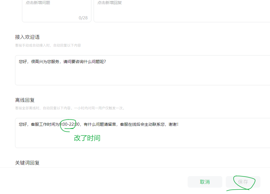 自动回复、快捷回复、自动接入都没有保存,什么原因