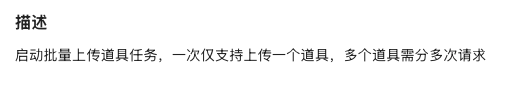 调用小程序道具发布接口https://api.weixin.qq.com/xpay/start_publish_goods?access_token=xxx&pay_sig=xxx报错:"PublishGoodsRes":"{\"errcode\":672770002,\"errmsg\":\"一次最多发布 1 个道具(item) "}"。可是同样一次性发布多个道具,有的时候就能成功。这是为什么呢?这个接口和道具上传接口支不支持批量呢?接口的这个描述是不支持的批量意思吗?那为什么有时候批量又可以成功。