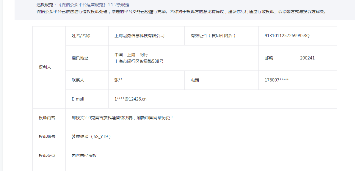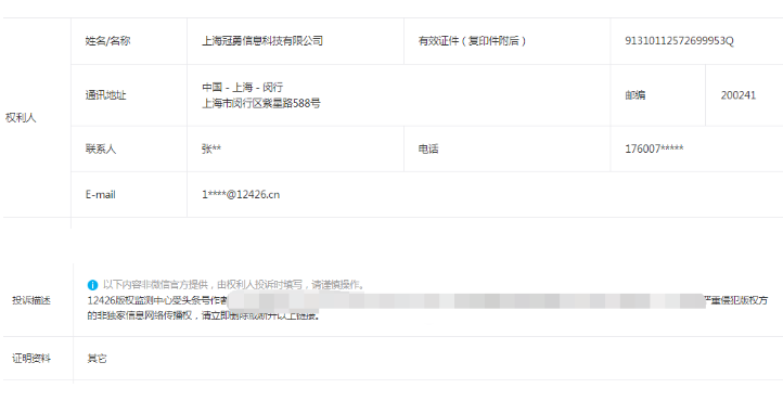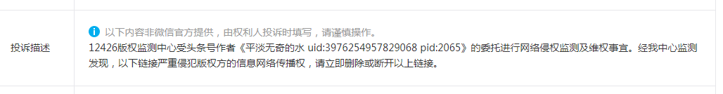 做公众号已经有几年了。所有内容均由自己原创并首发于微信公众号。但是自2013年起,多次收到来自主体公司“上海冠勇信息科技有限公司”的侵权投诉。打着12426版权监测中心受头条号作者《平淡无奇的水uid:3976254957829068pid:2065》的委托进行网络侵权监测及维权事宜。这种骗人的把戏恶意投诉行为。我就很纳闷自己原创的内容怎么就成了侵权别人的内容了呢。因此特意去今日头条搜索这个作者,一手发现是一个个人不怎么运营的空号。。。。。。。。真可把我郁闷注了。这是今日头条和上海冠勇信息科技有限公司一起合伙打压公众号作者啊。。。。以前遇到过其它平台来挖墙角的。但是没有遇到这么恶心挖墙角的。微信公众平台一直是我们自媒体创作者用心创作的好平台,这么一想也情有可原,毕竟各大平台都在抢优质内容创作者。但是用这种恶意投诉、批量投诉的行为真心太可耻。虽然公众号官方平台是公正的,最后都是不成立,但是恳请微信公众号官方能够制止这些恶意行为。给创作者一个安静、舒心的创作环境。