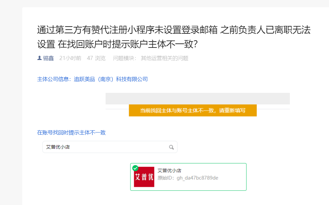 微信公众平台找回帐号时 提示 当前找回主体与账号主体不一致,请重新填写