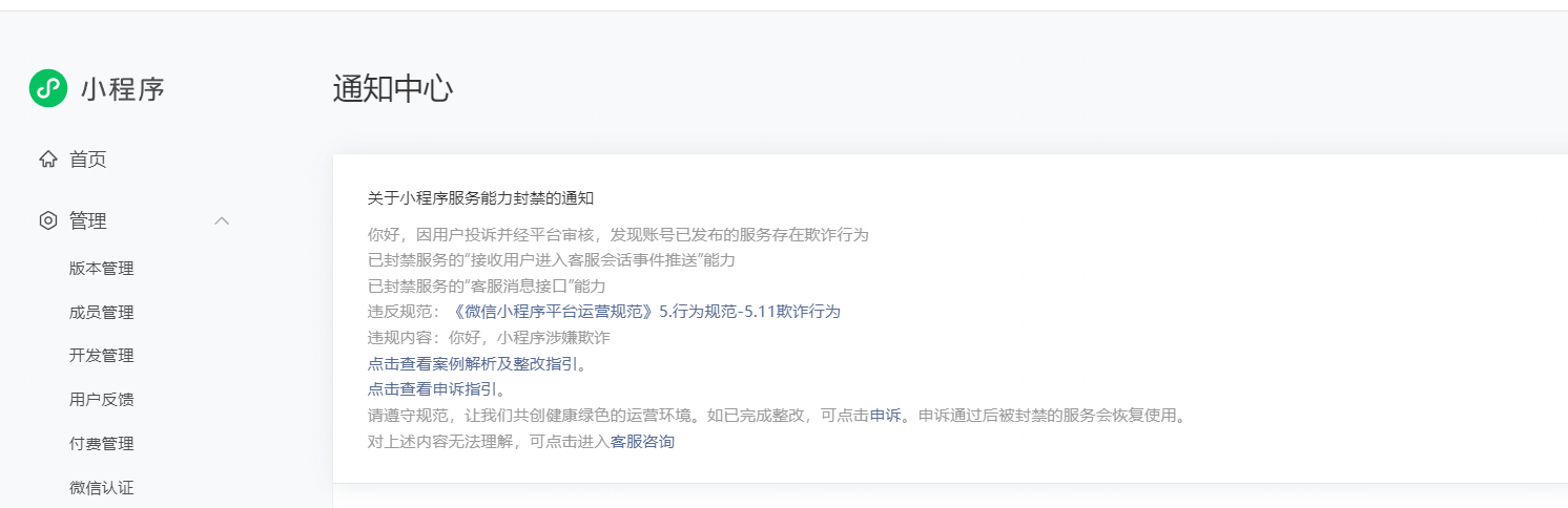 这个是新创建的小程序,前几天刚完成认证和备案,还没有投入使用,刚关联微信客服就被站内通知欺诈,违规内容只有简单的“你好,小程序涉嫌欺诈”