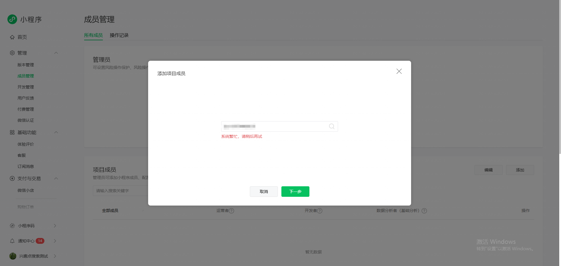 进入成员管理,想添加成员,搜索账号时一直显示系统繁忙(确定不是本人网络、或服务器网络繁忙的情况。因为同一时段请我朋友登录他的小程序,一切操作都是正常的)