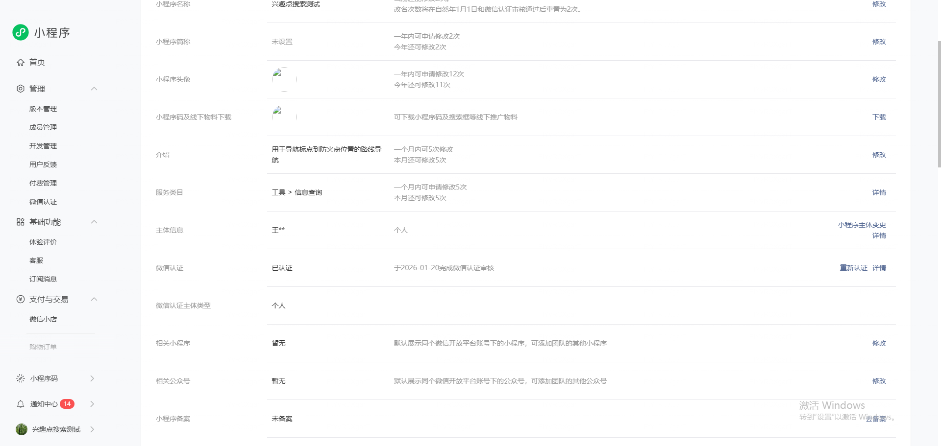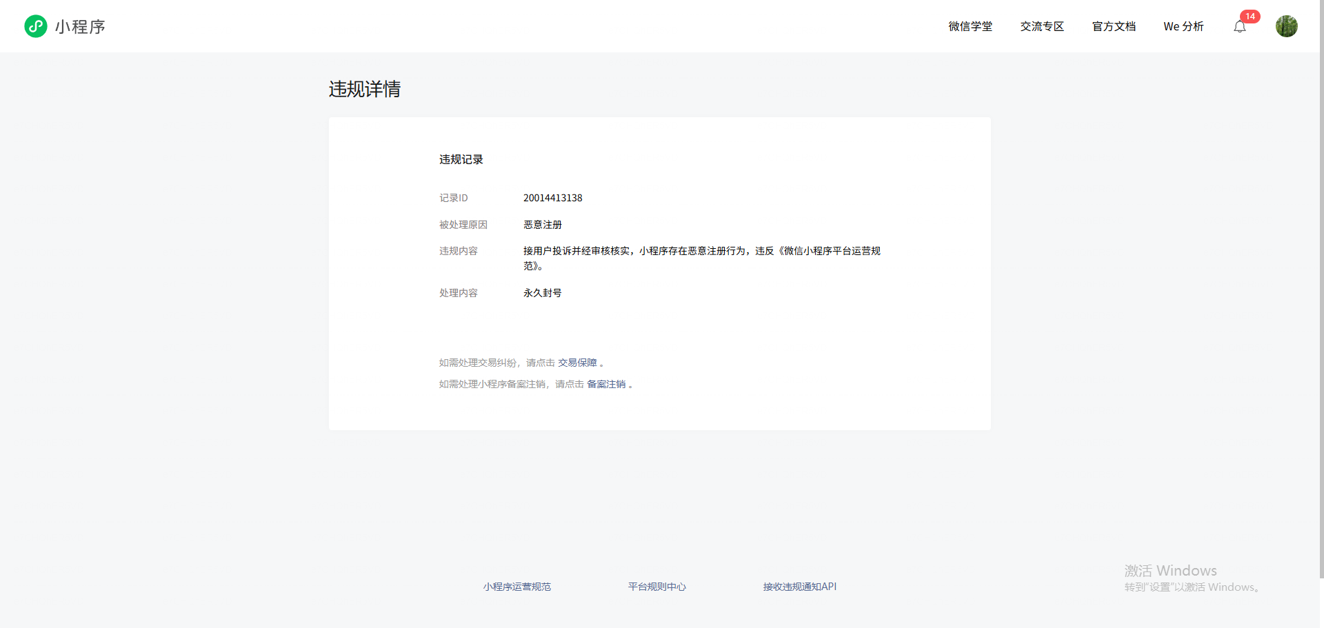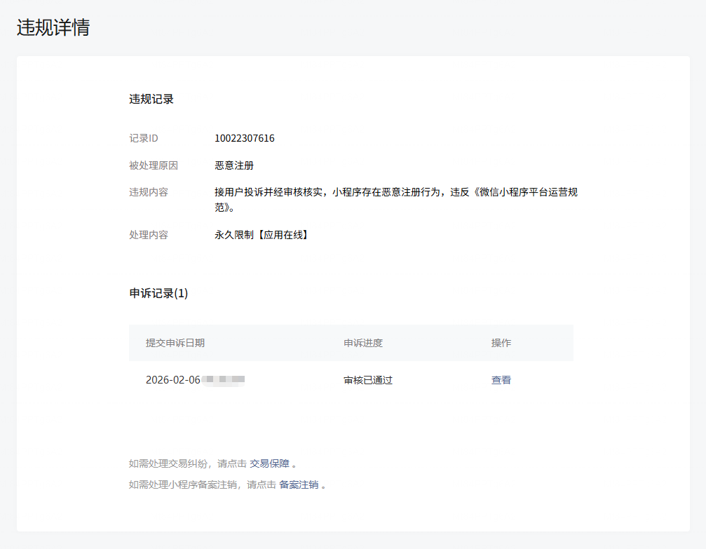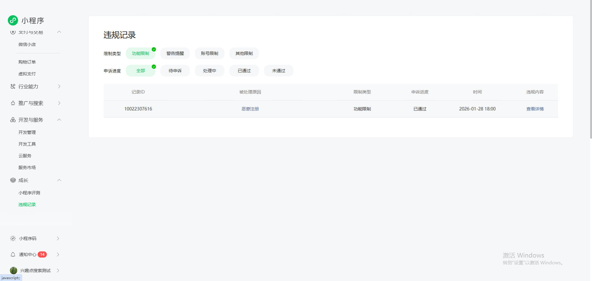查看违规记录,显示已申诉通过。(实际没有主动违规行为,小程序在测试阶段,功能非常简单,没有注册机制,申诉后通过)