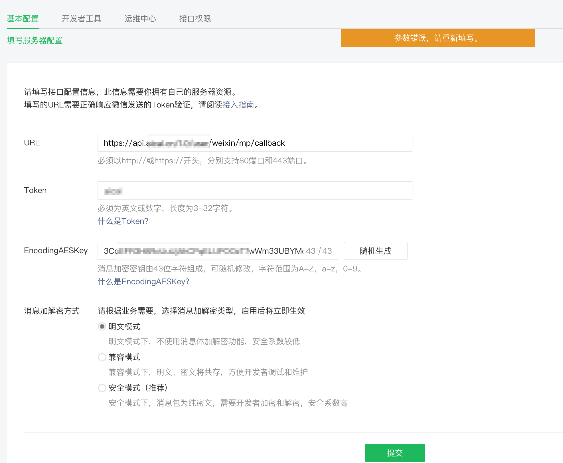 调试工具调试成功,但是基础配置里点击提交,会提示参数错误,请重新填写