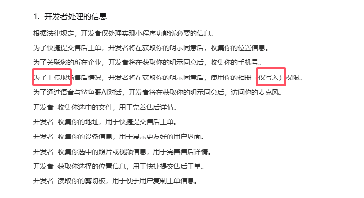 建议自行检查下所填写的描述是否符合对应的隐私接口,特别要注意标有【仅写入】的权限:比如【相册(仅写入)权限】的用途是保存图片或保存视频,是没有发布、扫码、上传等功能的哦,建议修改。