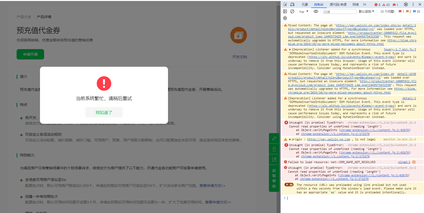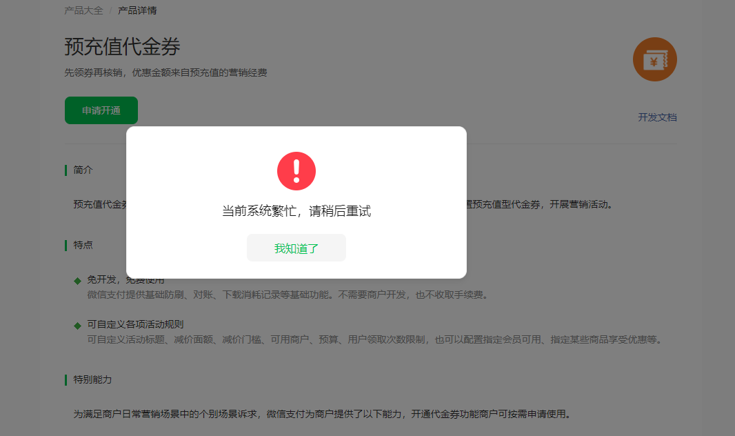 预充值代金券无法开通 提示系统繁忙稍后再试