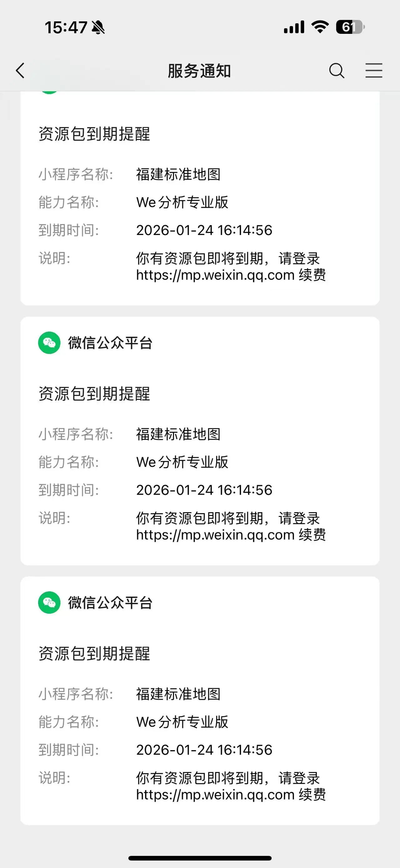 我25年初订购过一个资源包,到期了,一直给我发资源包过期提醒,间隔几天就发一次,还给我所有的开发者、体验者都发,一次连发三条,搞得领导都来问我这是怎么回事?我收到提醒了,没有想续订,怎么样能不要再给我以及小程序的其他使用者发过期提醒了?不堪其扰