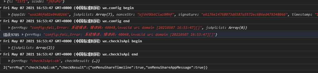 wx.error(function(err) { console.log('错误9785',err); }); 上面触发的,代码没问题,同样的代码同样的接口,通过这个appid的公众号获取配置就没问题