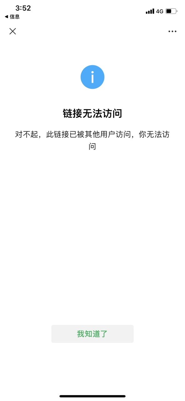2.收到的是链接,点击后提示:链接无法访问。(对不起,此链接已被其他用户访问,你无法访问)
