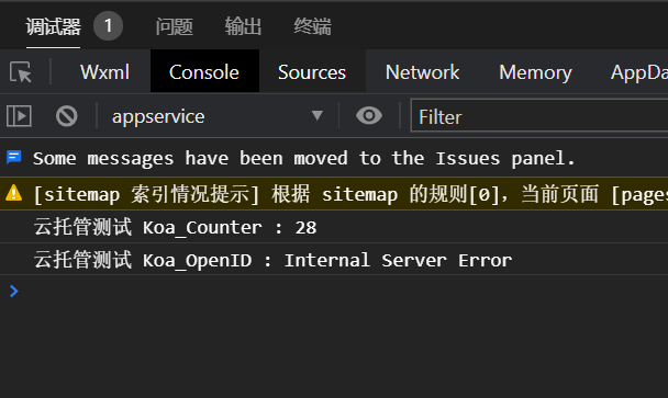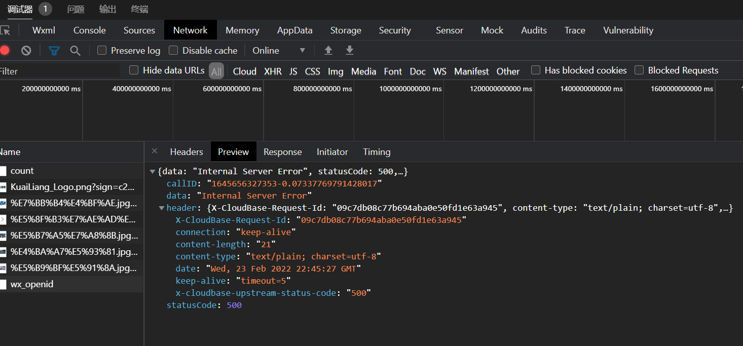 小程序端测试Post的api/count,返回正常(表明Koa运作和MySQL都已经正常状态),但是测试Get的api/wx_openid不成功,返回结果显示Internal Server error